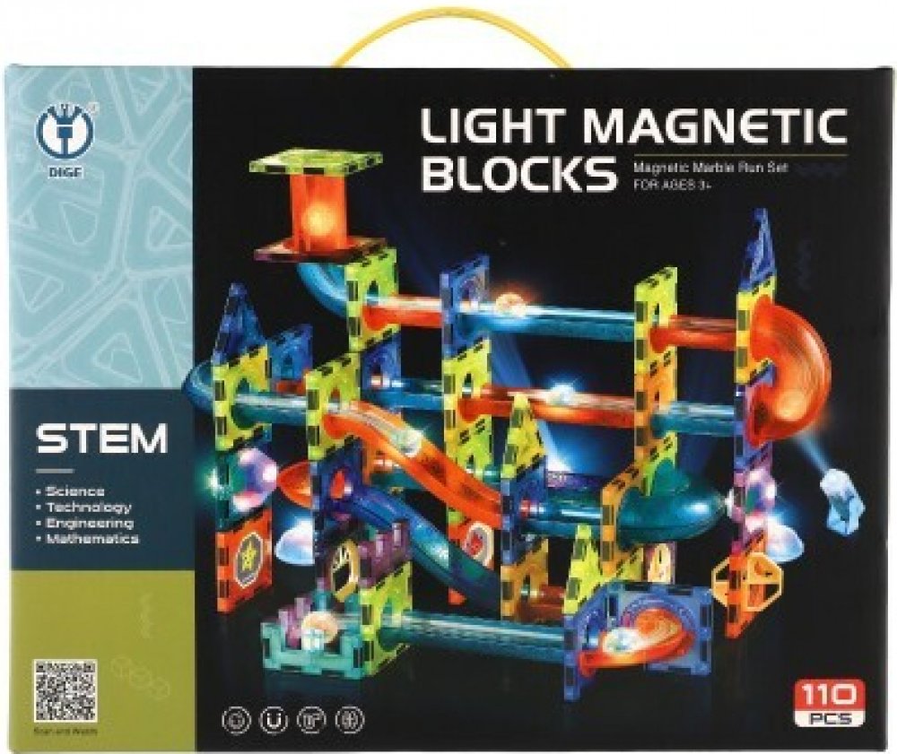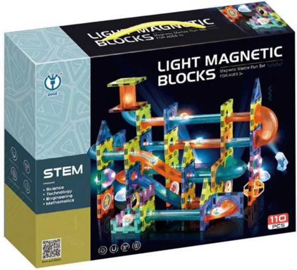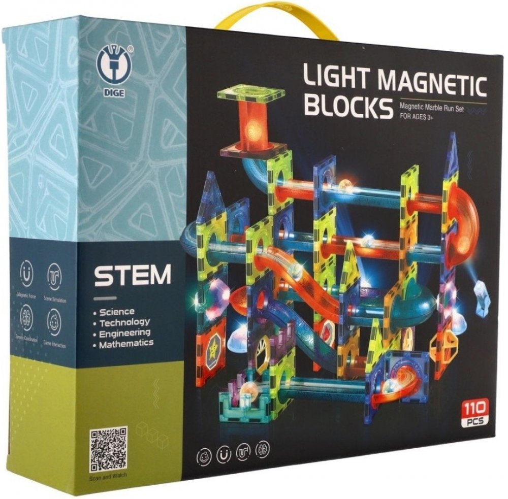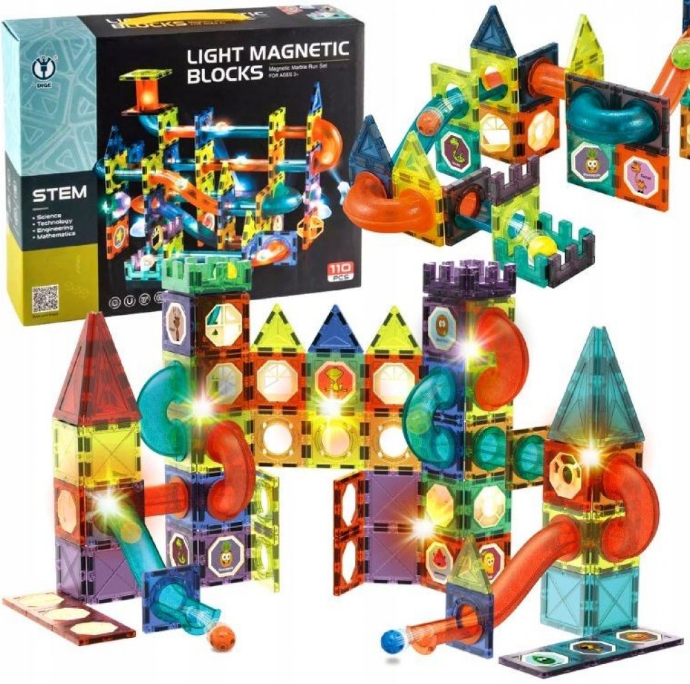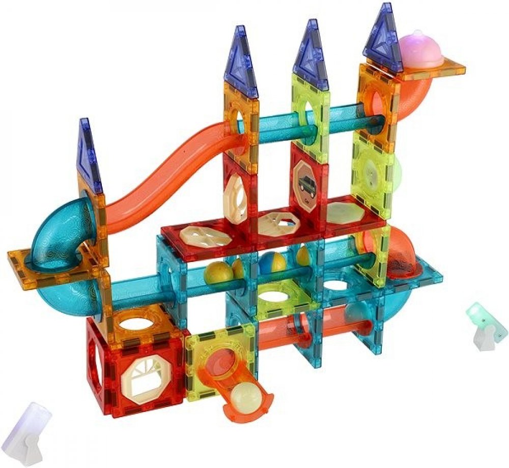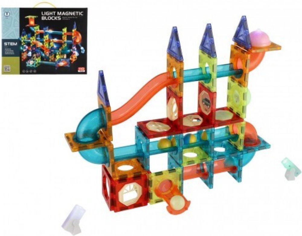 Sestavte si z magnetických dílků barevnou kuličkovou dráhu se světelnými efekty. Stavebnice rozvíjí jemnou motoriku a trénuje soustředění a zručnost. Tato sada obsahuje 100 ks + 16 kuliček. Doplňky jsou na baterie, které jsou součástí balení a jsou nevyměnitelné.