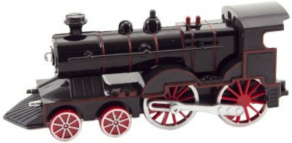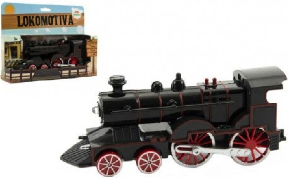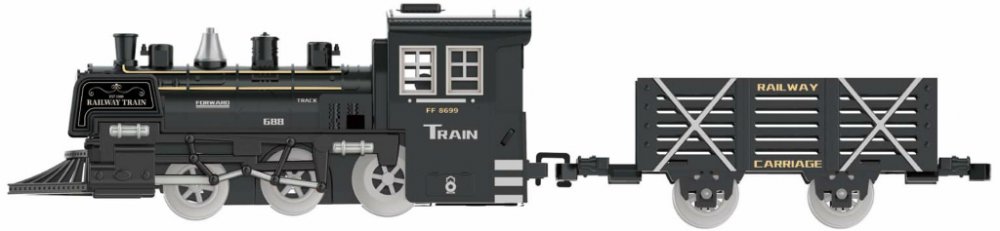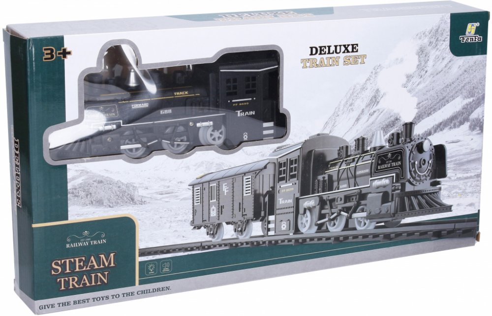 Vlak set. Rozměry železnice 75x75 cm, velikost mašinky 19,5 cm, vagónu 15,5 cm. Světelné, zvukové a kouřové efekty. 4xAA baterie do mašinky nejsou součástí. Přepínač ON/OFF na levé straně mašinky. Součástí mašinka, 1 vagón, 6 zahnutých kolejnic, nádobka na vodu. Nádržka na vodu pod stříbrným komínkem.