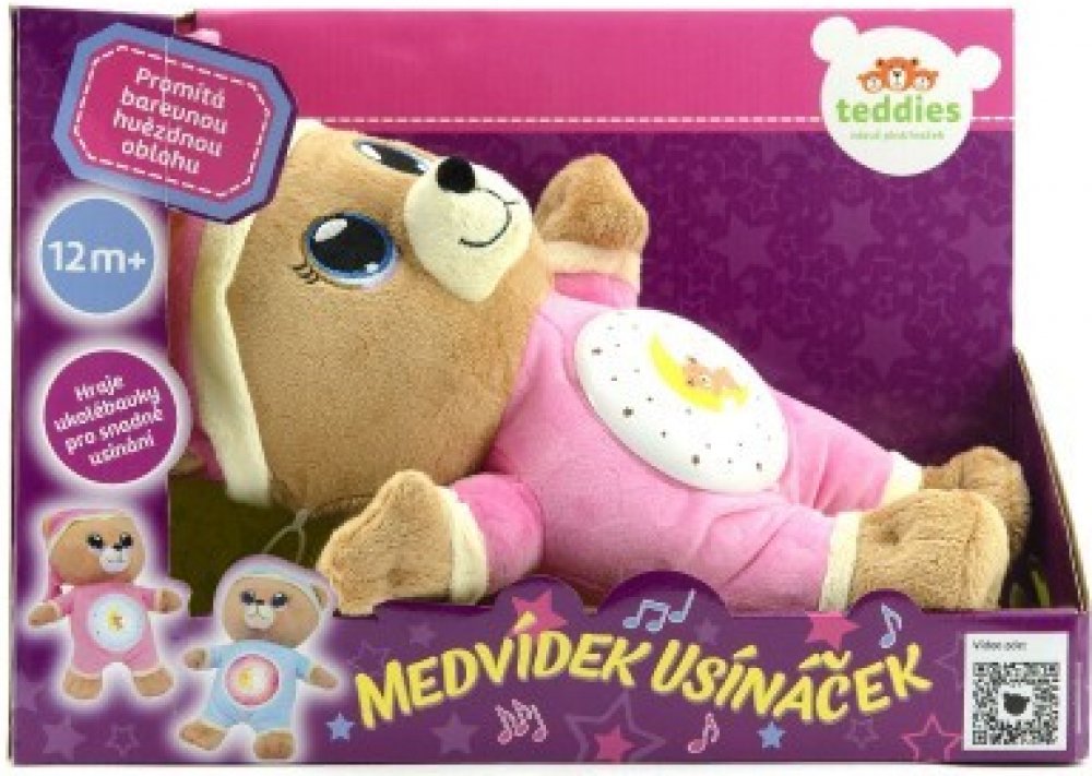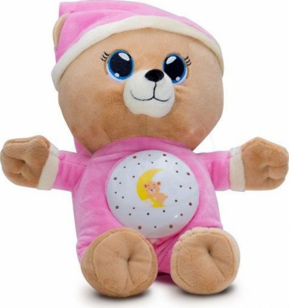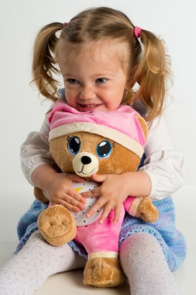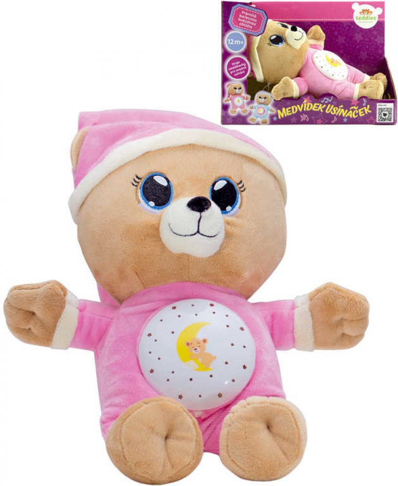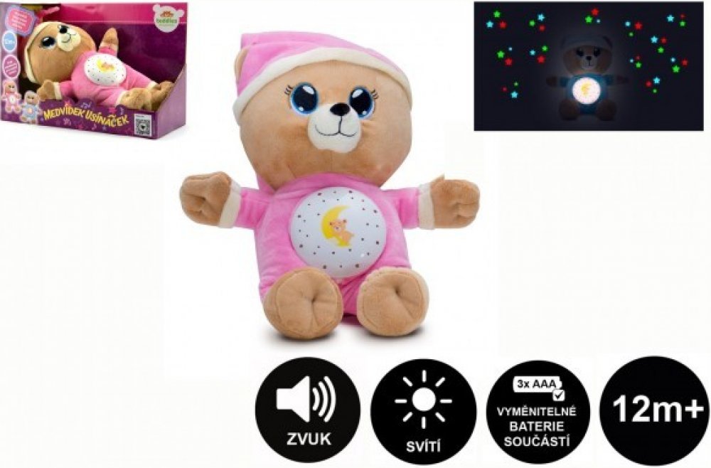 Medvídek v růžovém provedení, pro snadné usínání! Stiskněte tlačítko na bříšku medvídka, tlačítko se rozsvítí a medvídek začne hrát ukolébavky. Světlo můžete za tmy promítat i na strop nebo stěnu pokoje.