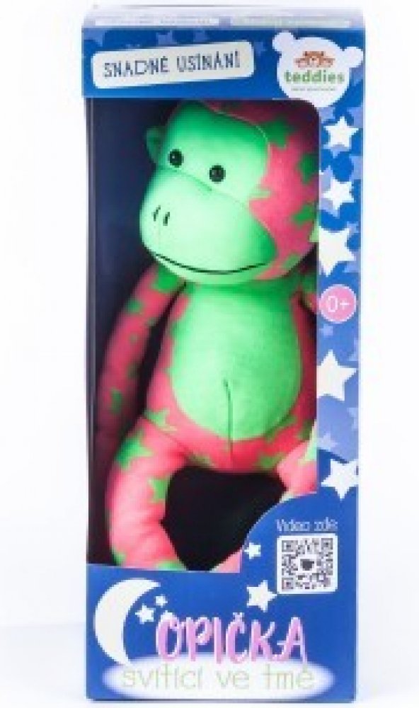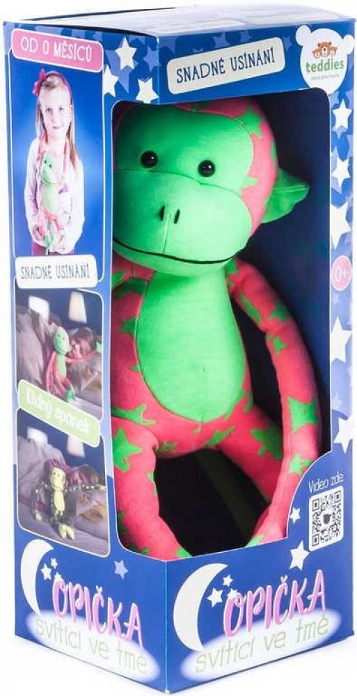 Opička pomůže dětem snadno usnout a klidně spát. V noci svítí jako noční obloha plná hvězd. Když ji postavíte na denní světlo nebo pod lampičku, vydrží ve tmě svítit i několik hodin. Díky suchému zipu jednoduše sepnete ruce i nohy k sobě.
