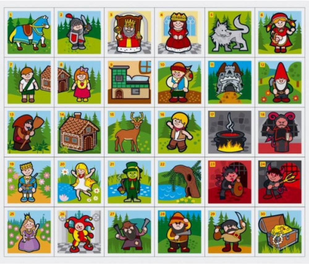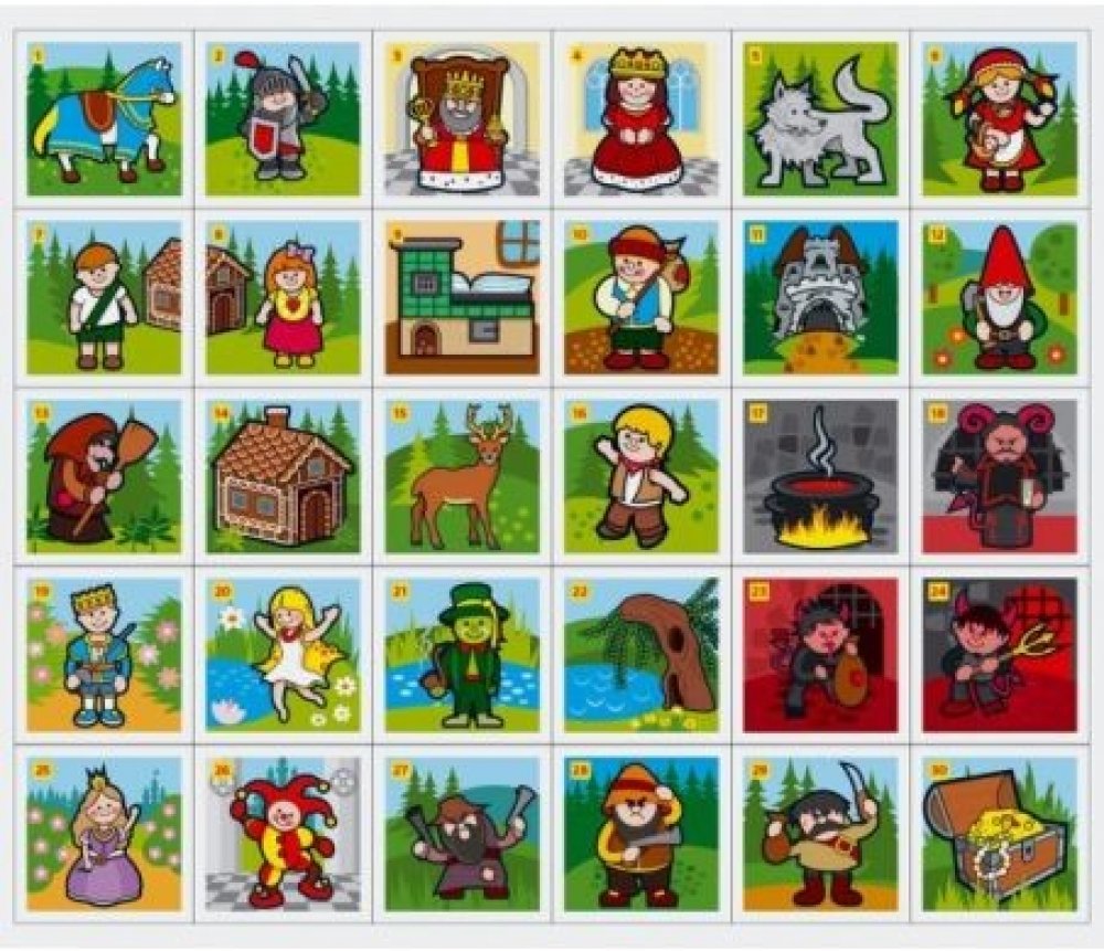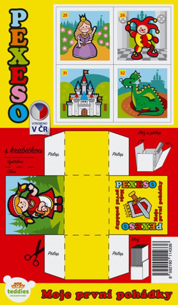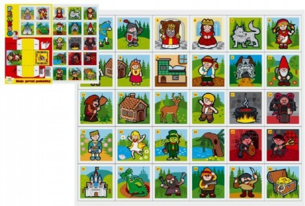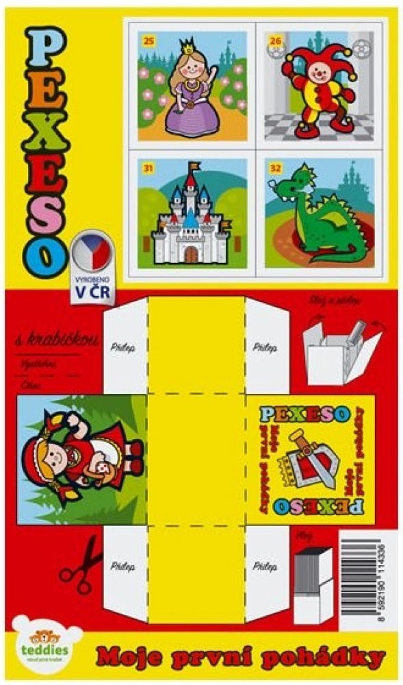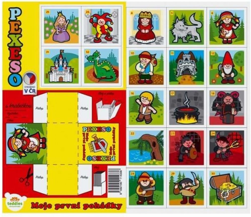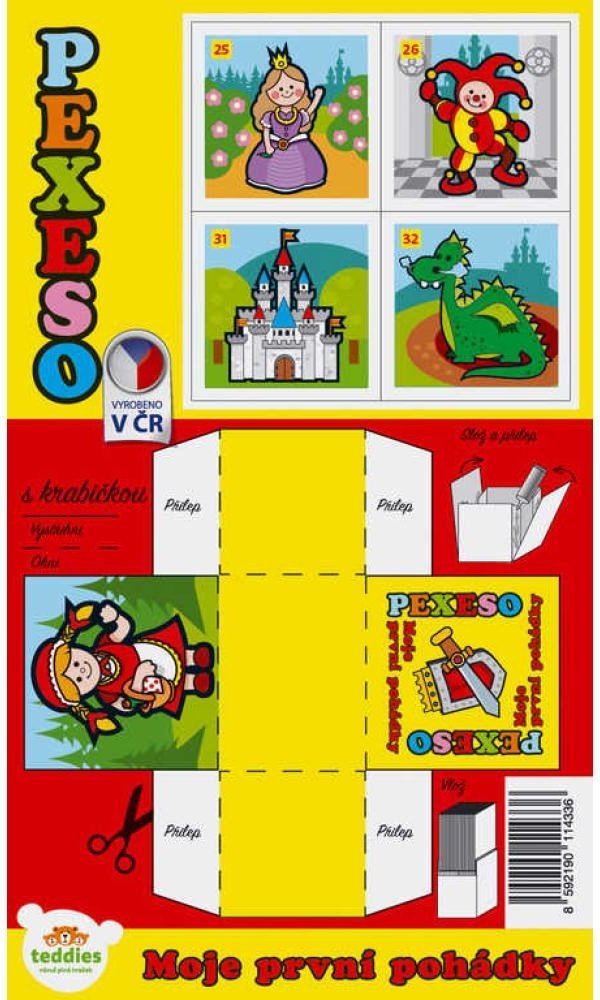 Papírové pexeso obsahuje 32 dvojic s veselými obrázky na motivy klasických pohádek. Děti si mohou sestavit i krabičku, do které si všechny kartičky mohou uklidit.