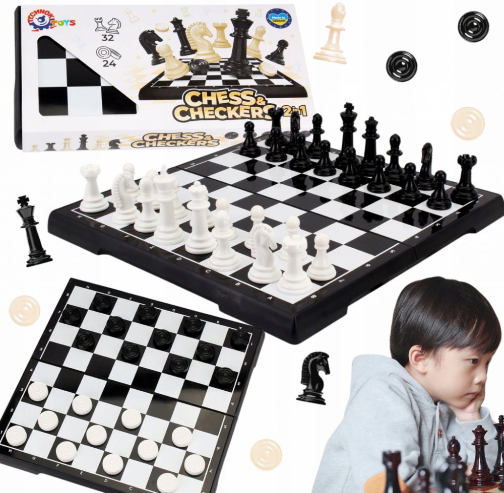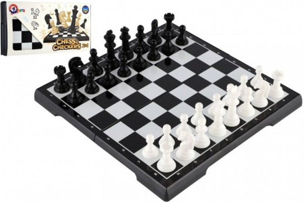 Set obsahuje dvě oblíbené deskové hry: šachy a dáma. Šachové figurky 32 ks, dámové kameny 24 ks a herní plán, vše je vyrobeno z odolného a kvalitního plastu. Nejsou magnetické.