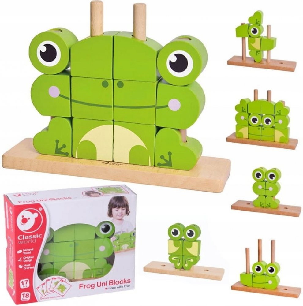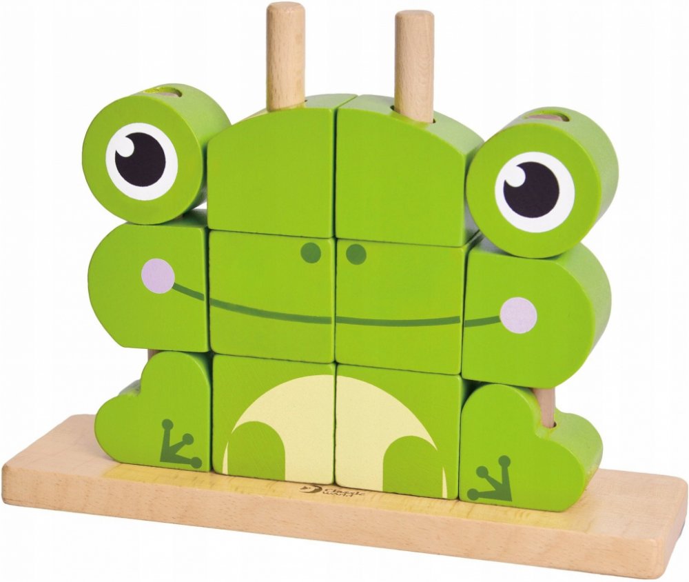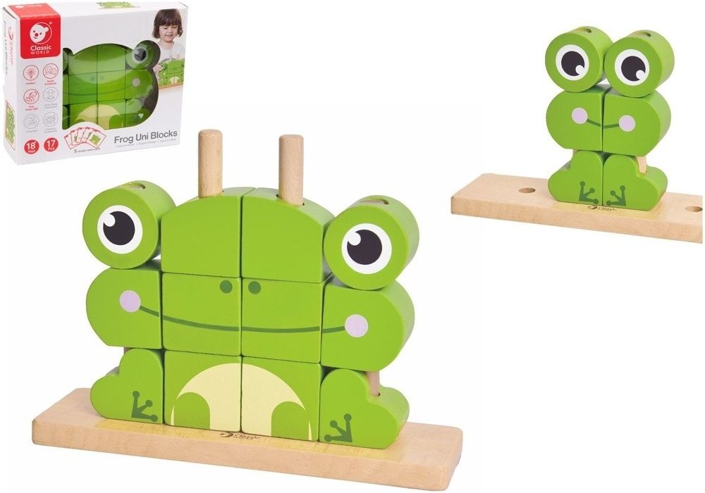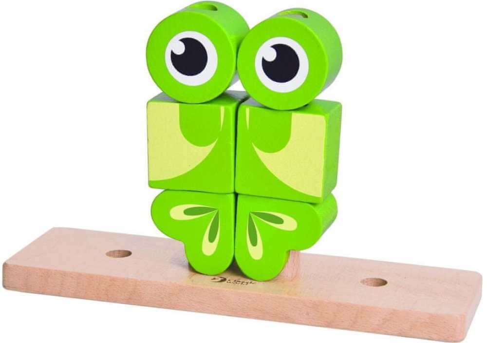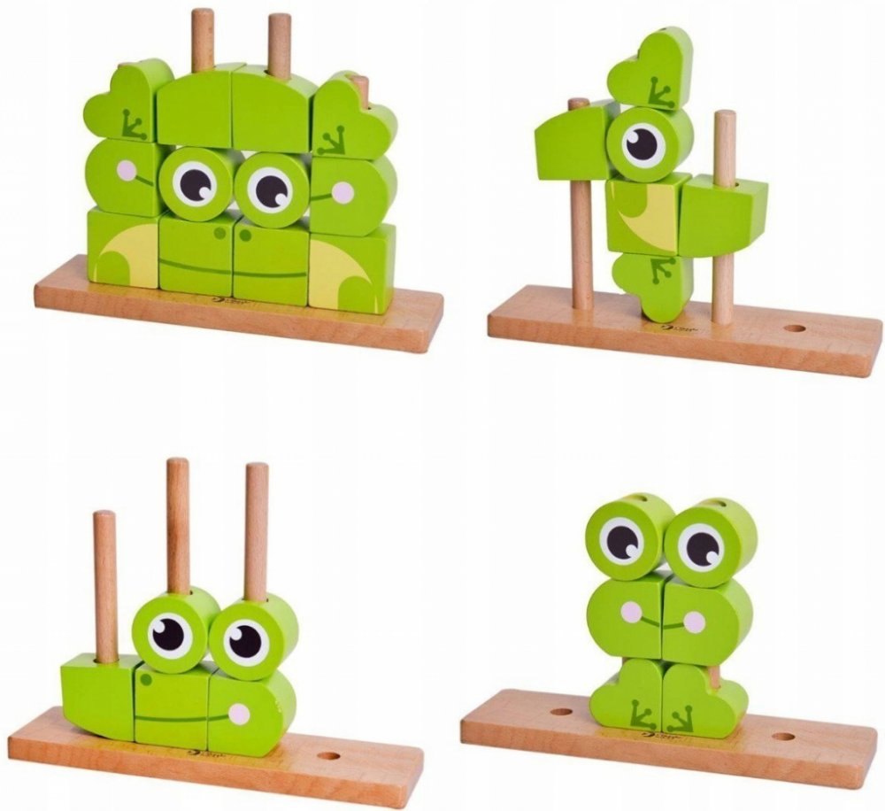 Skládanka žába obsahuje 17 dřevěných dílků (12 kostek, podložka, 4 tyčky), které lze různě stavět na podložku s tyčkami. Děti si tak mohou postavit různé předměty i zvířata. V sadě najdete 5 oboustraných předloh pro skládání. Konkrétní barvu nebo druh výrobku není možné z technických důvodů zvolit, objednávce bude přidělena náhodná varianta dle skladových možností.