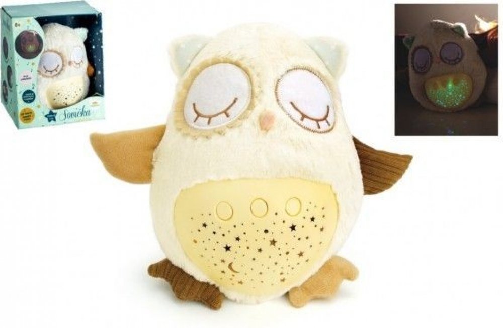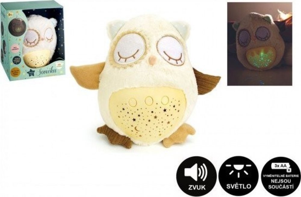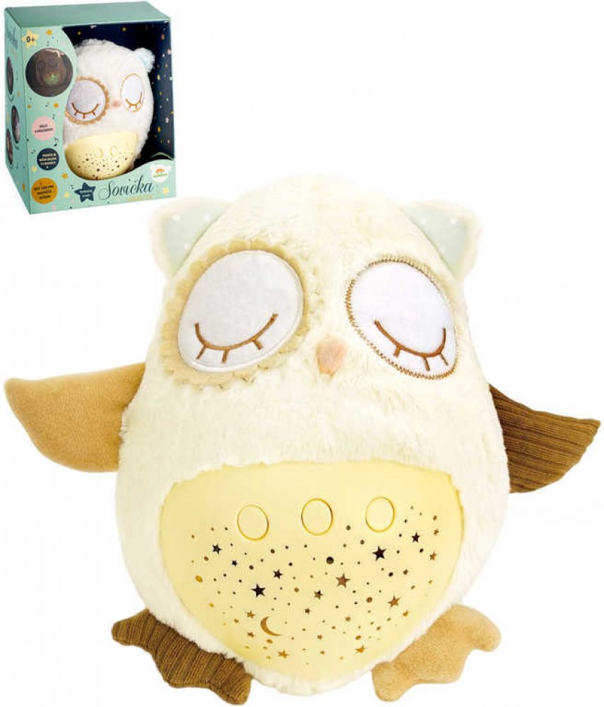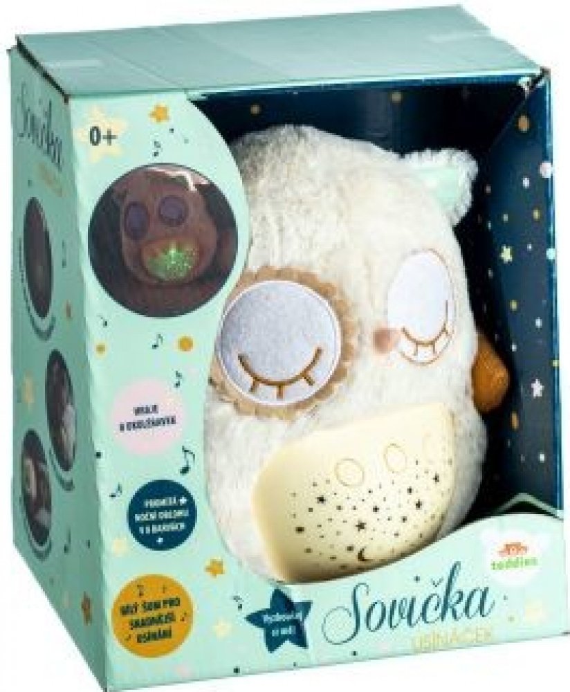 Plyšový usínáček v podobě sovičky pomáhá dětem snadněji usnout za pomocí příjemných melodií a tlumeného světla. Po zmáčknutí tlačítek na bříšku se z pokojíčku stane rázem říše snů. Sovička promítá noční oblohu v 8 barvách, hraje 8 ukolébavek a také zvuky, na které jsou děti zvyklé od maminky z bříška. Po odehrání ukolébavky promítá noční oblohu cca 1 minutu, poté se vypne. Velikost sovičky: 25 cm ...