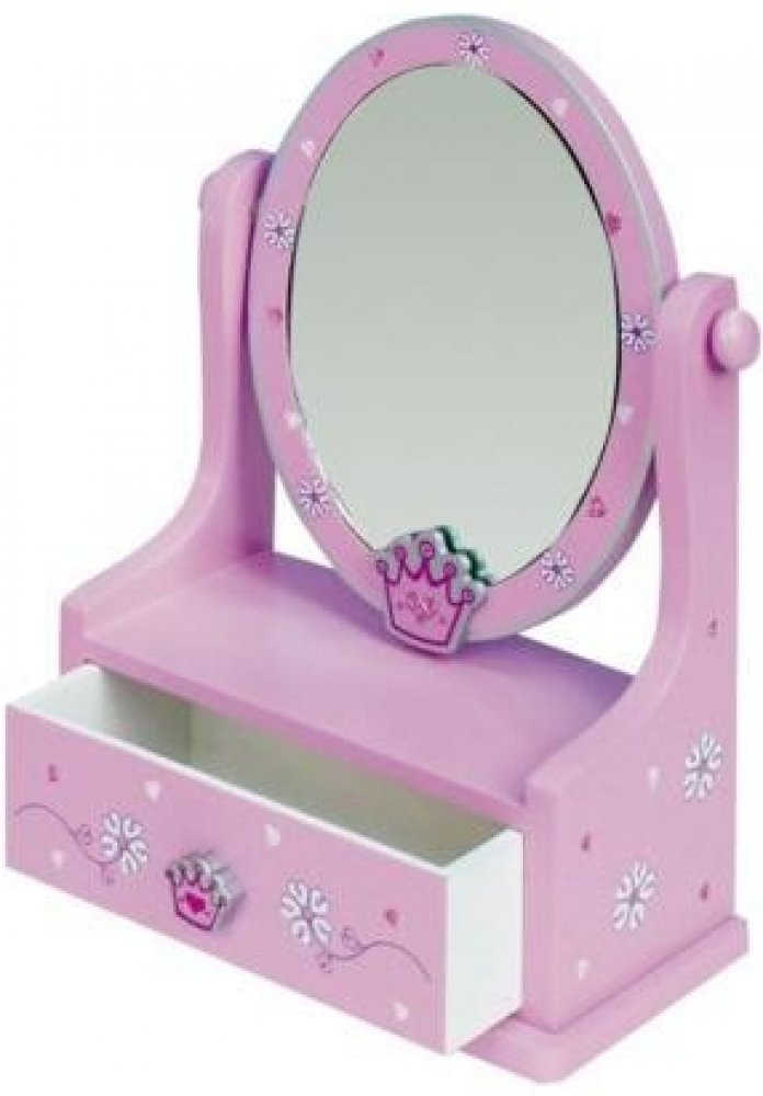 Každá malá parádnice se musí ráno načančat a nasadit si všechny sponečky a čelenku. K tomu potřebuje zrcadlo a hlavně místo, kam si všechny ty cennosti uloží. Šperkovnice splňuje oboje - má oválné zrcadlo a prostorný šuflík. Vyrobená je z růžově natřeného dřeva.