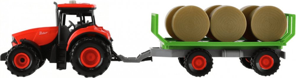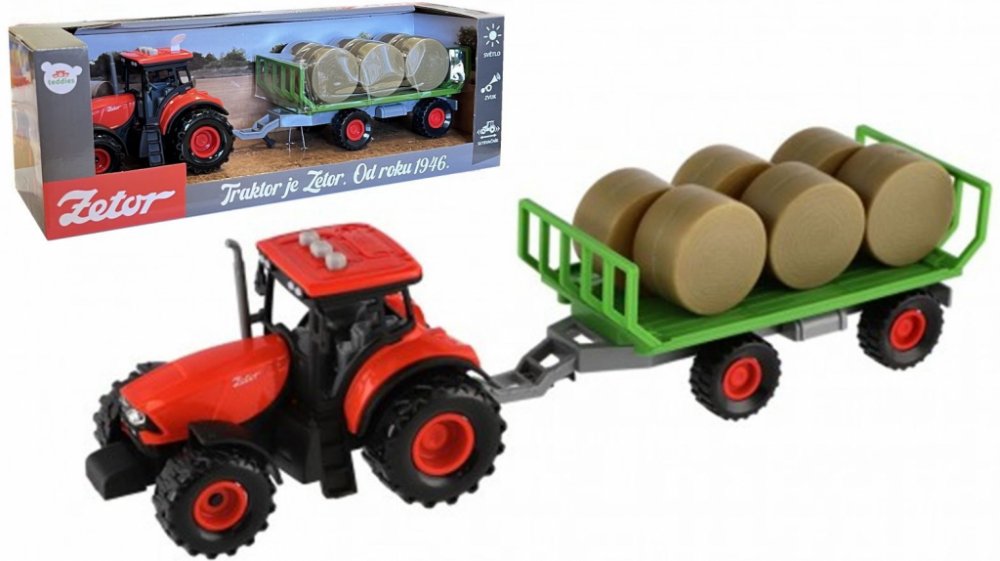 Krásný model zemědělského traktoru Zetor s dlouholetou tradicí, kterou musí milovat snad každý. Vyražte na pole s pořádným traktorem se světlem a zvukem! Traktor s vlekem na seno je nepostradatelný pomocník pro každého malého farmáře! Vlek můžeš jednoduše odpojit a traktor využít k dalším pracím. Traktor jezdí na setrvačník. Zmáčknutím tlačítek traktor vydává reálné zvuky a svítí mu světla. Hračka...