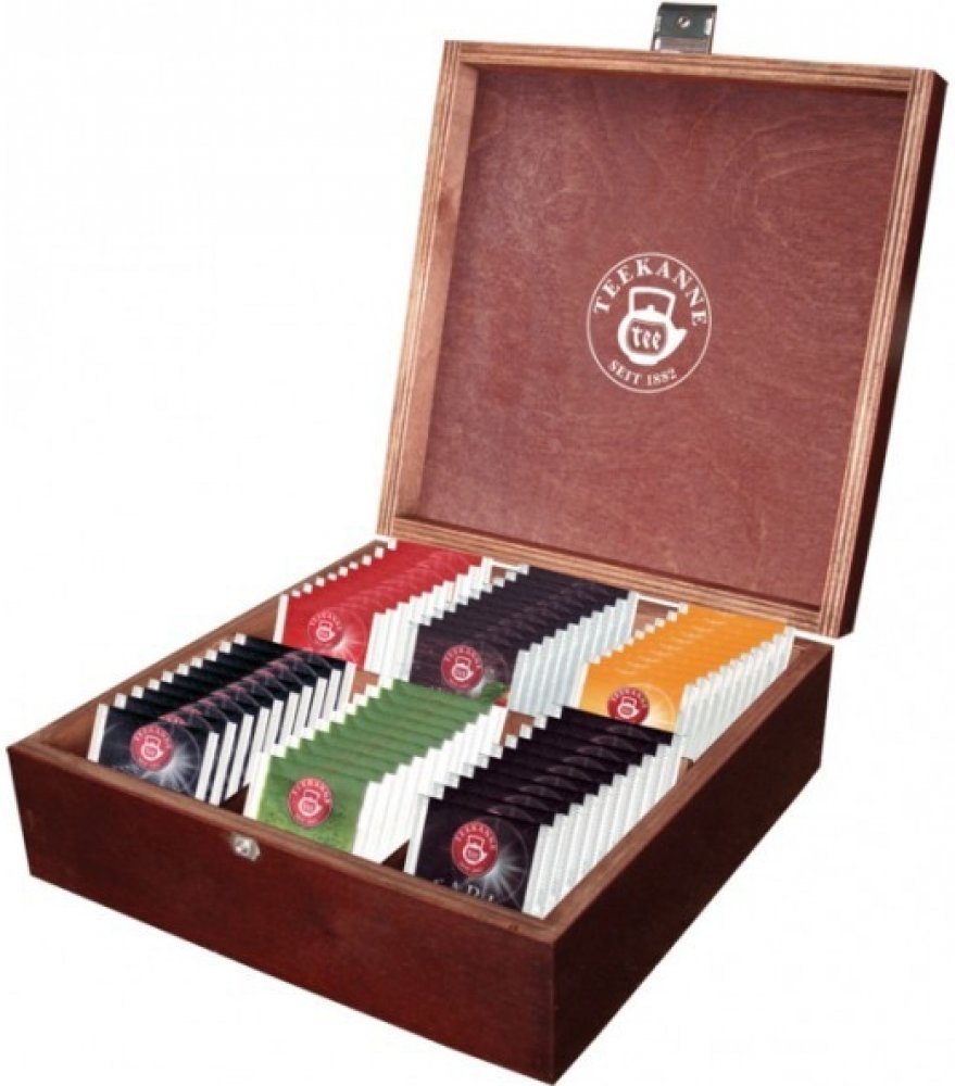 Tato dárková kazeta obsahuje celkem 6 druhů těch nejlepších čajů od Teekanne (5 aromatizovaných a 1 černý), každý druh po 10 nálevových sáčcích v originální, pěkně provedené, dřevěné krabici.