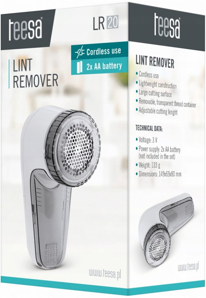 Nevzledné žmolky na Vašem oblečení po vyprání? Nebo možná vlněná deka, do které se každý večer omotáváte, už dávno ztratila svěžest? Odstraňovač žmolků Teesa LR 20 vrátí lesk vašim oblíbeným věcem. Díky třem režimům nastavení střihu efektivně odstraníte velké i malé a velmi jemné chmýří z jakéhokoli typu látky. Ať už tedy chcete osvěžit jemnou halenku nebo tlustý svetr, žmolkovač Teesa LR 20 s velkými břity vám zajistí hladký efekt opravdu rychle. Ergonomický design zařízení v kombinaci se snadno vyjímatelnou nádobou zajistí, že odstraňování chmýří z oblečení pomocí Teesa LR 20 bude opravdu pohodlné. Vlastnosti Bezdrátový provoz Lehká konstrukce Velká řezná plocha Vyjímatelná, průhledná nádoba na závit Nastavitelná délka řezu Parametry Napětí: 3V Napájení: 2x AA baterie (není součástí balení) Hmotnost: 133 g Rozměry: 149 x 69 x 80 mm Barevné provedení bílo šedé Navod použití v českém jazyce Odstraňovač vrásek LR20 Bezdrátový provozLehká konstrukceVelká řezná plochaVyjímatelný průhledný zásobník na vráskyNastavitelná délka řezuTECHNICKÉ PARAMETRYNapětí: 3 VNapájení: 2 x baterie AA (není součástí balení)Hmotnost: 133 gRozměry: 149x69x80 mm