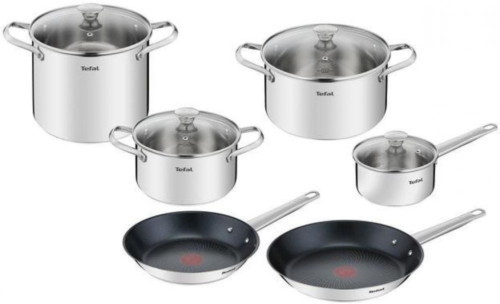 sada nádobí na vaření 10 ks, sada obsahuje rendlík 16 cm, kastrol 20 a 24 cm, hrnec 22 cm, skleněné poklice, pánev 24 a 28 cm, materiál nerezová ocel, vnitřní nepřilnavý povrch pánví Titanium, indikátor teploty Thermo-Signal, kompatibilní typ ohřevu: indukce, plyn, sklokeramika, elektřina, hladinové značky, pevné nýtované rukojeti, vhodné do trouby (bez poklice), vhodné do myčky (B922SA55)