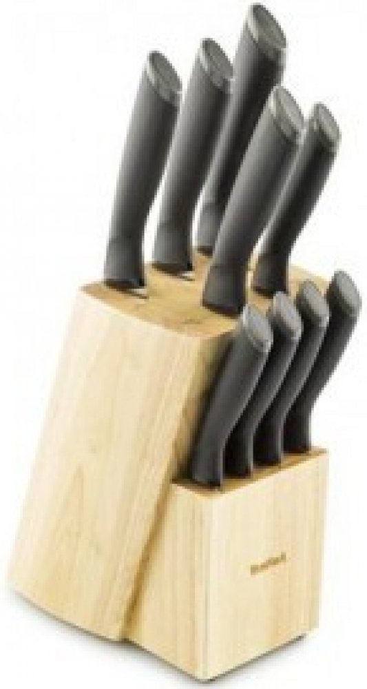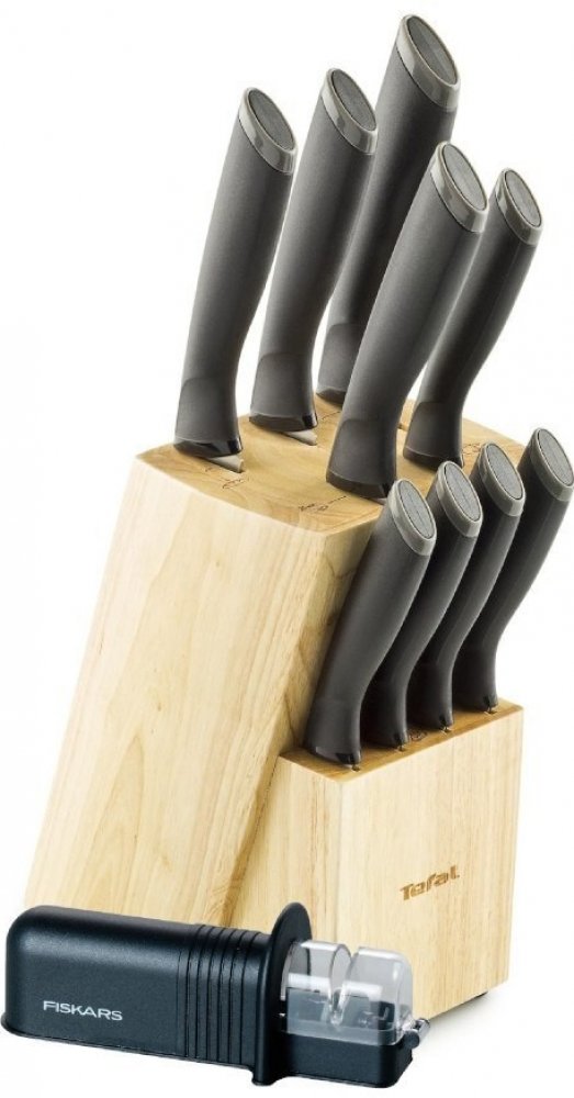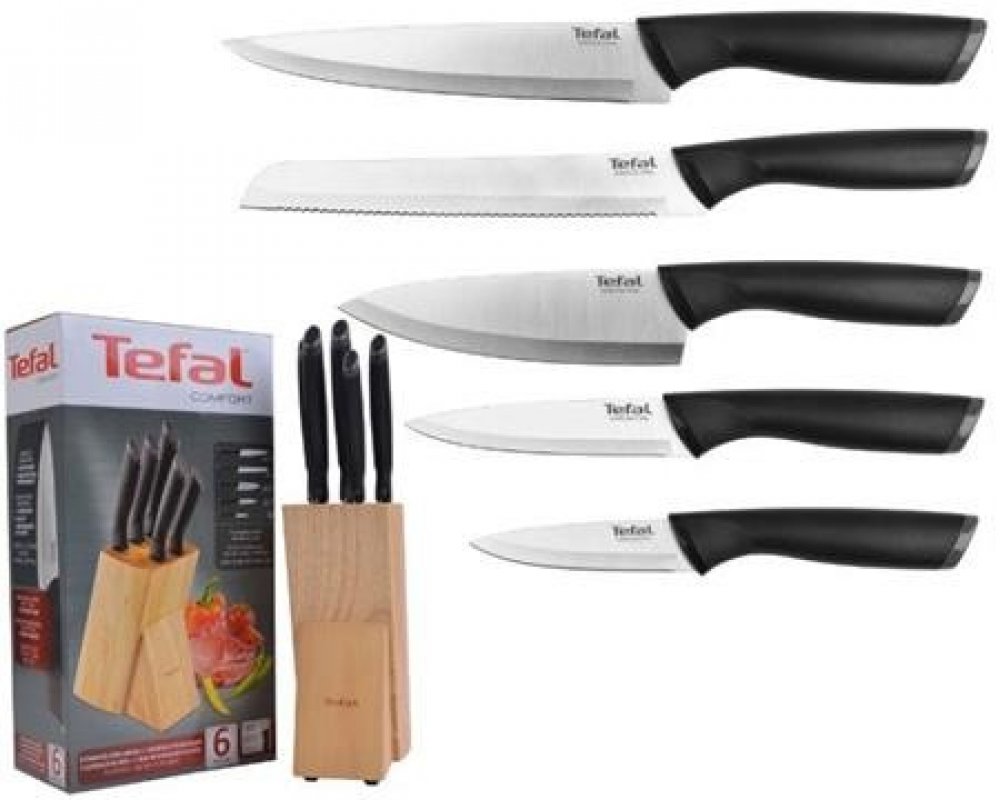 Sada kvalitních kuchyňských nožů od prověřené značky v praktickém dřevěném bloku. Značka Tefal pro vás vyvinula propracované a kvalitní nože řady Comfort Touch. S nožem se velmi snadno krájí. Rukojeť s černým protiskluzovým povrchem vám zaručí lepší a pevnější držení nožů. Práce s noži tak bude přesná a rychlá. Díky použitým materiálům při výrobě se nože snadno čistí a udržuje. Dlouhá životnost je samozřejmostí. Nože Tefal Comfort Touch se řadí mezi spolehlivé pomocníky do každé kuchyně. Této sadě najdete 9 různých nožů s této řady uložené v praktickém dřevěném blokuKlíčové vlastnostisada nožů od spolehlivého výrobcekvalitní materiálčepele z nerezové ocelisnadné krájení rukojeť s protiskluzovým povrchempro ruční mytíuloženy v dřevěném blokuSada obsahuje:porcovací nůž 20 cmnůž na chléb 20 cmChef nůž 15 cmvykrajovací nůž 9 cmuniverzální kuchyňský nůž 12 cm4× nůž na steak 11cm