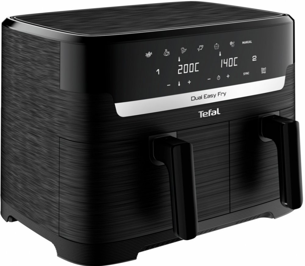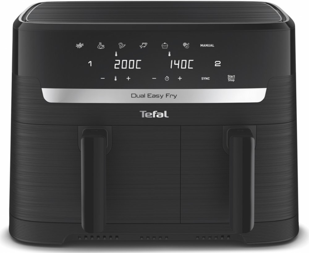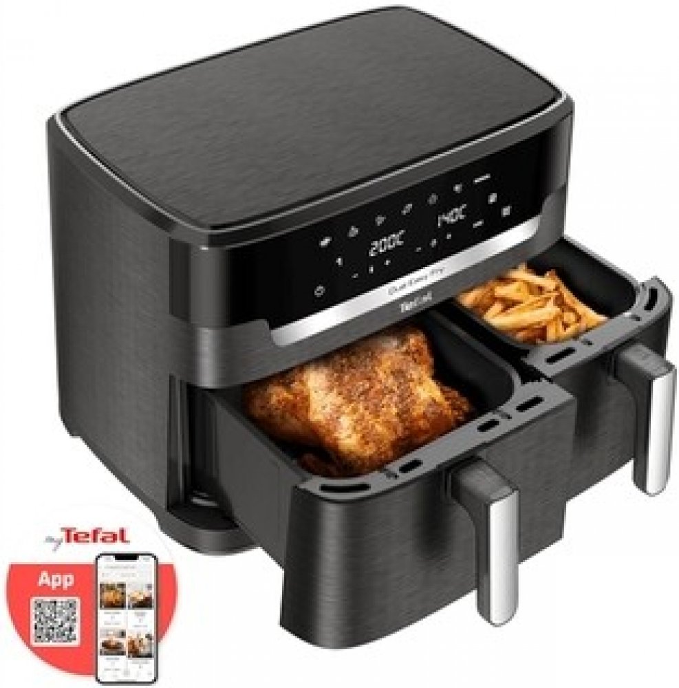 Horkovzdušná fritéza TEFAL EY901N10 Horkovzdušná fritéza se dvěma nádobami Nádoba XXL 5,2 l Běžná nádoba 3,1 l Využijte XXL nádobu k přípravě velkých jídel jako je kuře, obě nádoby pro štědré porce hranolků, nebo běžnou nádobu, když jste sami 7 přednastavených programů: Hranolky Kuře Zelenina Ryba Dezert Sušení Ruční režim Spotřebuje až o 70 % méně energie a připraví pokrmy až o 40 % rychleji než klasické trouby Technologie Extra-Crisp Vychutnejte si křupavé a dozlatova opečené pokrmyna minimu tuku nebo zcela bez něj Mobilní aplikace zdarma s exkluzivní nabídkou receptů hotových do 15 minut Obě nádoby i mřížka jsou vhodné do myčky nádobí pro snadné čištění Součásti balení: Dual Easy Fry horkovzdušná fritéza 2 vyjímatelné fritovací mřížky rychlý úvodní návod návod k použití přístup k bezplatné mobilní aplikaci Barva černá