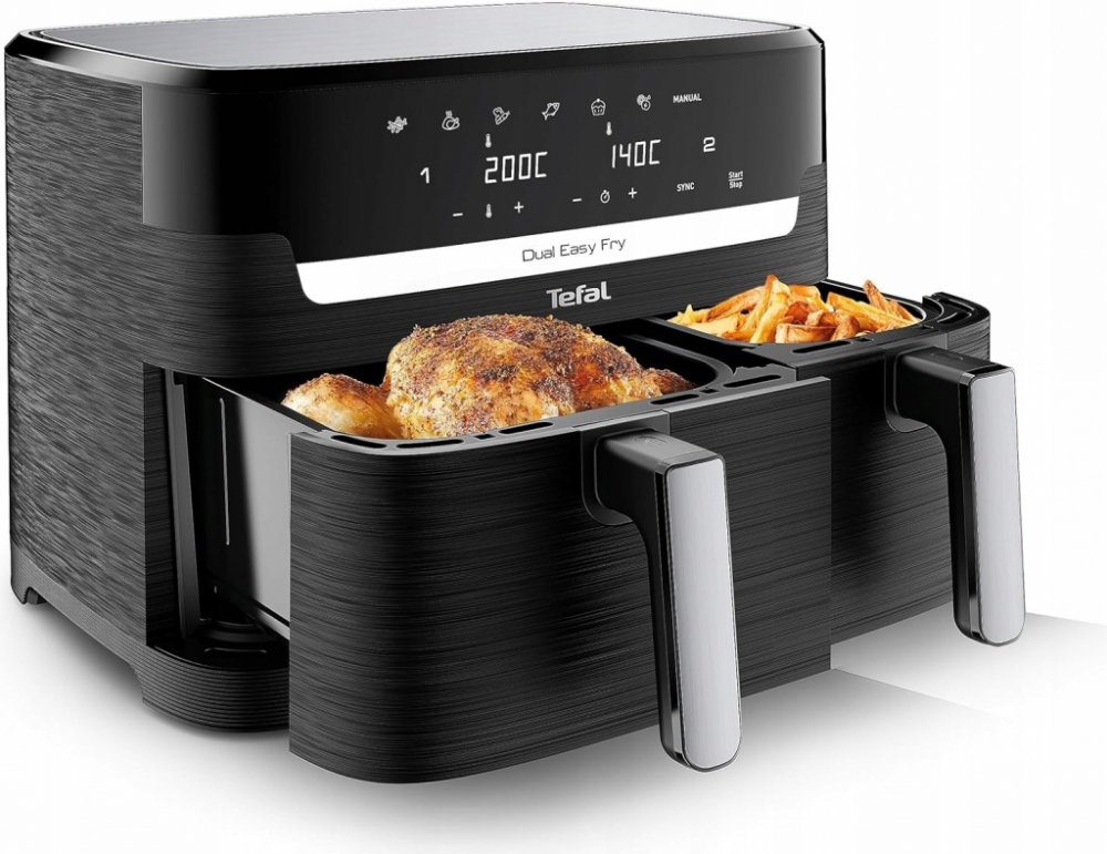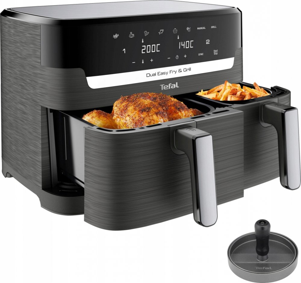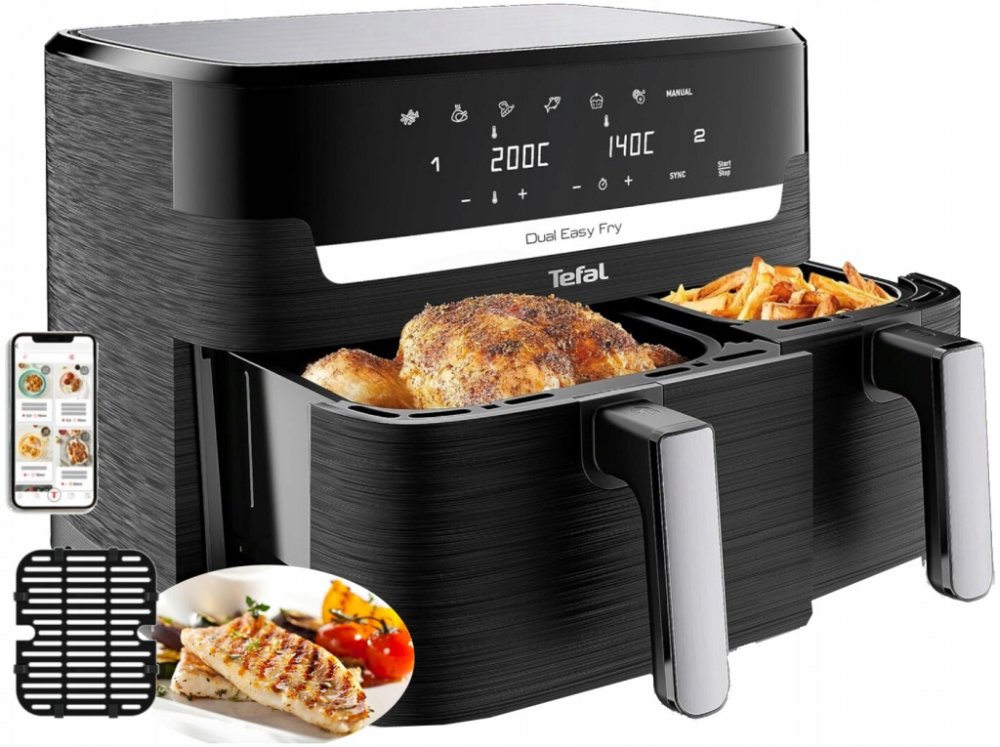 Dvoukomorová horkovzdušná fritéza se dvěma nezávislými zásuvkami, XXL zásuvkou a normální zásuvkou pro vaření dvou různých pokrmů najednou – pro plné jídlo v jednom cyklu.