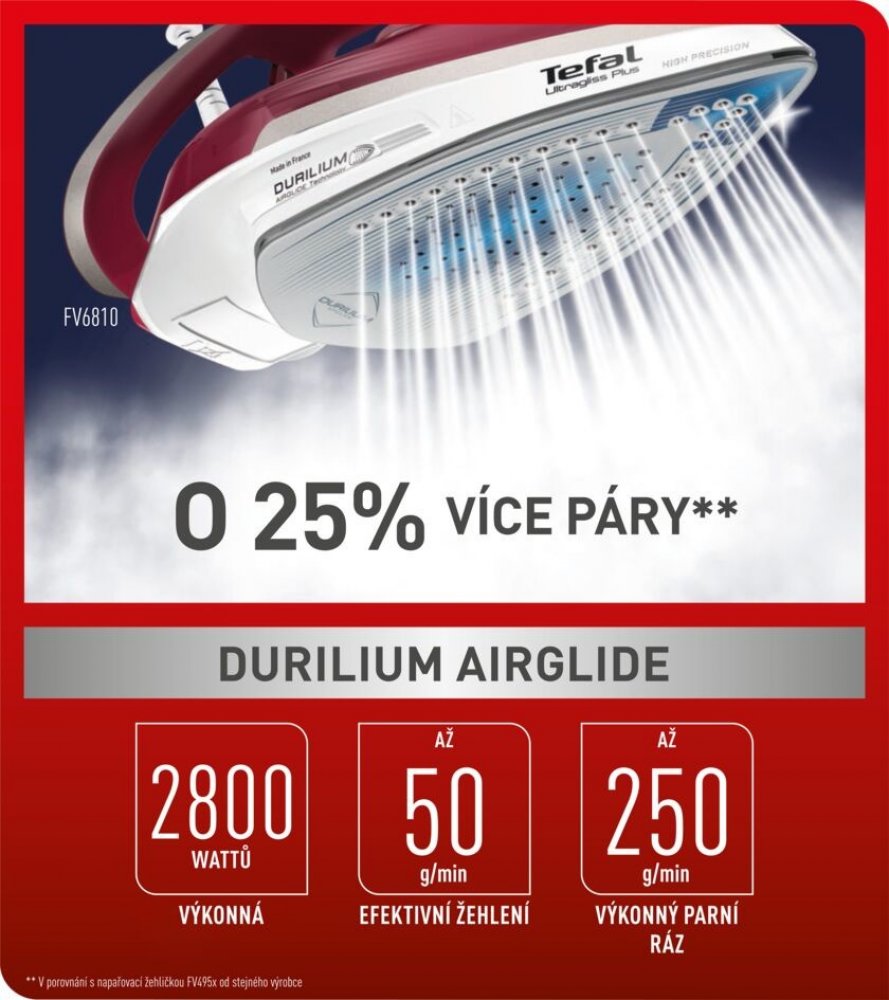 Napařovací žehlička TEFAL Ultragliss Plus FV6810E0 Napařovací žehlička TEFAL Ultragliss Plus byla navržena pro dokonalé výsledky každý den, s vysoce účinným parním výkonem, nejrychlejším skluzem od značky Tefal a dlouhou životností. Tato napařovací žehlička s vysokým výkonem má až o 25 % vyšší parní výkon a je vybavena výkonem 2800 W pro rychlé zahřátí a výkonný parní ráz na odolné záhyby. Zvláště účinný parní výkon Vyzkoušejte vyšší rychlost a účinnost díky vysoce účinné žehlicí ploše poskytující až o 25 % více parního výkonu* pro dokonalé výsledky, na které se můžete každý den spolehnout. 2800 W pro rychlé zahřátí Perfektní napařovací žehlička pro každodenní použití, 2800W energie zajišťuje rychlou zahřívací dobu, pro výkon, který je tu pro vás, kdykoli jej potřebujete. Efektivní výsledky žehlení Nepřetržitý parní výkon až 50 g/minutu. Pro rychlé a snadné žehlení a dokonalé výsledky během chvilky. Výkonný parní ráz Silný parní ráz až 250 g/minutu poskytuje silný výkon, který si poradí se silnějšími látkami a odolnými záhyby. 100% aktivní parní otvory pro maximální distribuci páry, s o 30 % vyšším počtem parních otvorů než předchozí generace Ultragliss pro nejvyšší účinnost zajišťující dokonalé výsledky. Vysoce kvalitní žehlicí plocha Nová žehlicí plocha Durilium Airglide je číslo 1 v kluznosti od značky Tefal. Zajišťuje působivý výkon a široké pokrytí parou, s patentovanou technologií a odolností, která je určená k dlouhodobému používání. Eko režim Využijte úsporu energie s režimem eco, který vyžaduje o 20 % méně energie, pro výkon vstřícný k životnímu prostředí a nižší účty za elektřinu. Snadný přístup díky přesné špičce Špička žehličky má speciální tvar, díky němuž je žehlení okolo knoflíků daleko snadnější. Snadné vertikální napařování Napařování jemných a velkých oděvů je snadné díky funkci vertikální páry. Ideální pro vyhlazení záhybů u obleků a jiných visících oděvů - dokonce i záclon. Dlouhotrvající výkonnost Žehlicí plocha s dlouhou životností a odolností proti poškrábání vám dává na dosah ruky dlouhodobý výkon v podobě vysoce kvalitní napařovací žehličky vyrobené pro dlouhodobé používání. Klíčové vlastnosti Zvláště účinný parní výkon Žehlicí plocha Durilium AirGlide Snadný přístup díky přesné špičce Snadné vertikální napařování Technické parametry Parní ráz 250 g/min Příkon 2800 W Bezdrátová ne Funkce automatického vypnutí ne Anti-Drip systém ano Svislé napařování ano Systém odvápňování ano Objem nádržky 270 ml Konstantní pára 50 g/min Délka přívodního kabelu 2 m Hmotnost 1,3 kg Obsah balení Napařovací žehlička TEFAL Ultragliss Plus FV6810E0