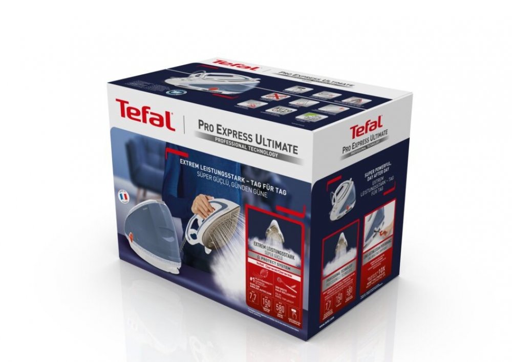 Vysokotlaký parní generátor Tefal Pro Express Ultimate GV9565E0 s příkonem až 2 600 W dosahuje nadprůměrného výkonu s výstupem páry až 150 g/min a funkcí parního rázu až 580 g/min. Je vybaven pokročilou technologií vysokotlakého bojleru a dvojitou ochranou proti vodnímu kameni. Žehlicí plocha Durilium AirGlide Autoclean poskytuje dokonalou klouzavost beze skvrn na oblečení. Intuitivní ovládací panel s 5 druhy programu. Nádržka na vodu se snadno vytahuje a generátor se snadno přenáší díky Lock systému. Vysoká teplota a tlak ničí až 99,99 % bakterií ve všech textiliích. 10 let jednoduché opravitelnosti se značkou Tefal.