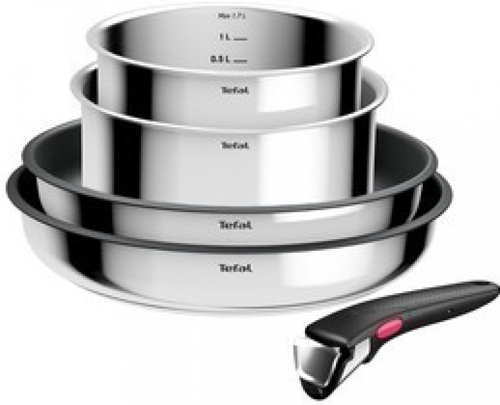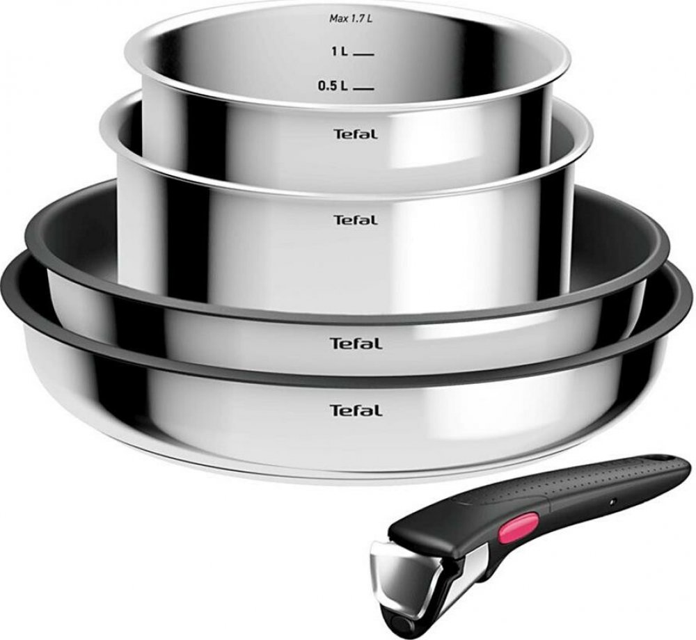 Sada nádobí TEFAL Ingenio L881S504 5 ks Systém odnímatelné rukojeti pro výjimečnou každodenní praktičnost a všestrannost Na sporáku, v troubě i v chladničce Sada obsahuje: Pánve Ø 24 / 26 cm Rendlíky Ø 16 / 18 cm 1 odnímatelná rukojeť Odolnýnepřilnavý povrch pánve pro každodenní snadné vaření a čištění Pánev lze mýt v myčce, aby byl úklid po vaření snadný a maximálně praktický, což je ideální pro časté použití Ultra kompaktní stohovatelný design nádob pro praktické uskladnění, které ušetříaž 50 % místa Kompatibilní s plynovými, elektrickými, sklokeramickými a indukčními varnými deskami, vhodné i do trouby (kromě skleněné poklice a rukojeti) Bezpečná a patentovaná odnímatelná rukojeť unese až 10 kg a vztahuje se na ni záruka 10 let Barva nerez