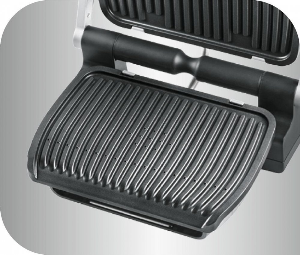 * Snadná údržba: nepřilnavý povrch grilovacích desek je snadno omyvatelný, navíc grilovací desky a odkapávací miska na šťávu vyjmutelné a omyvatelné v myčce nádobí.