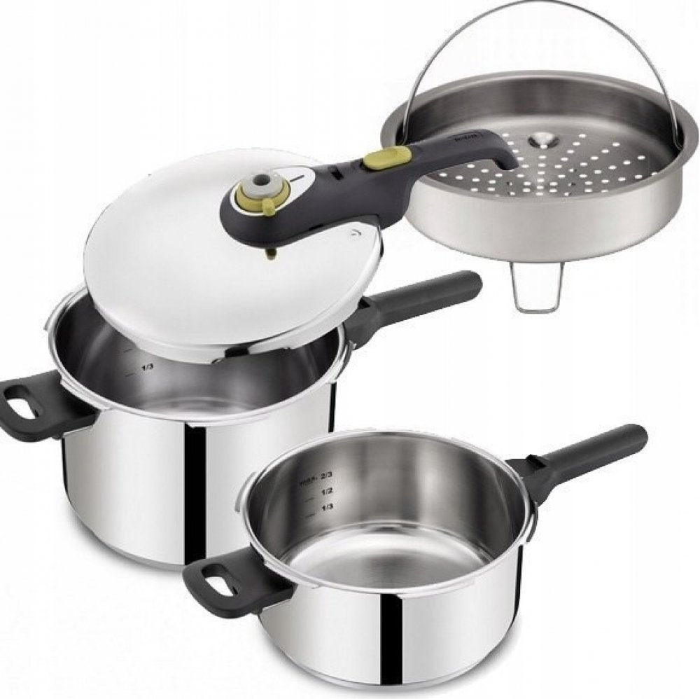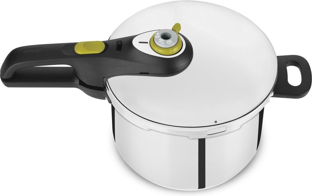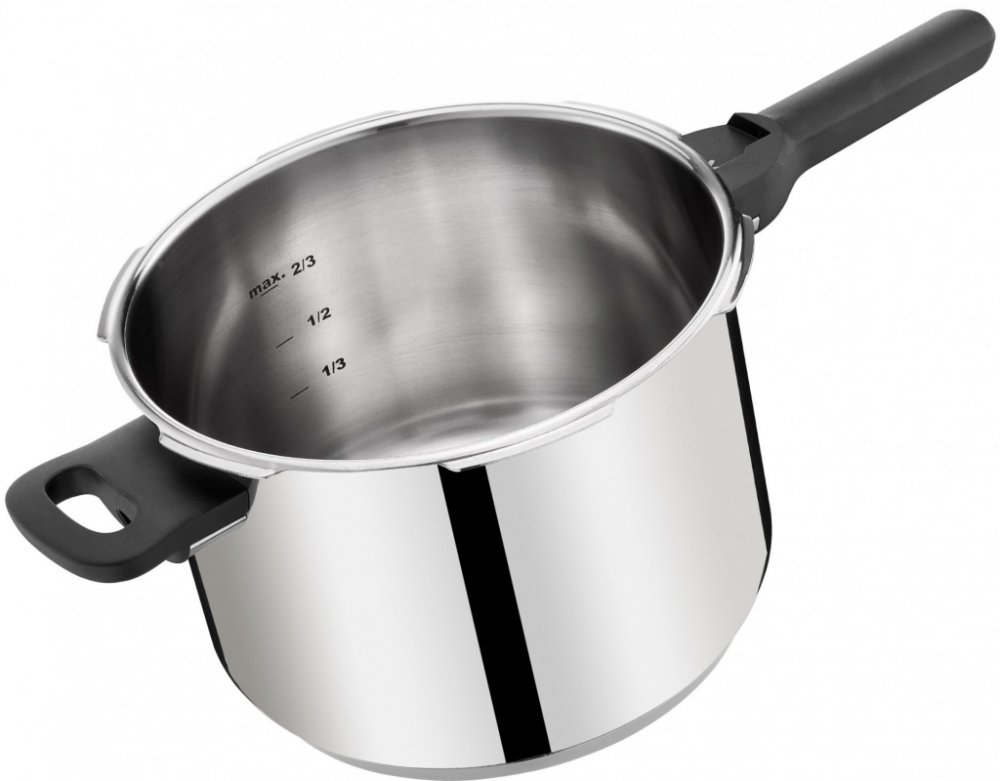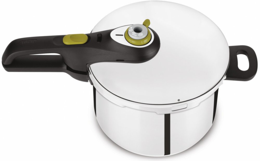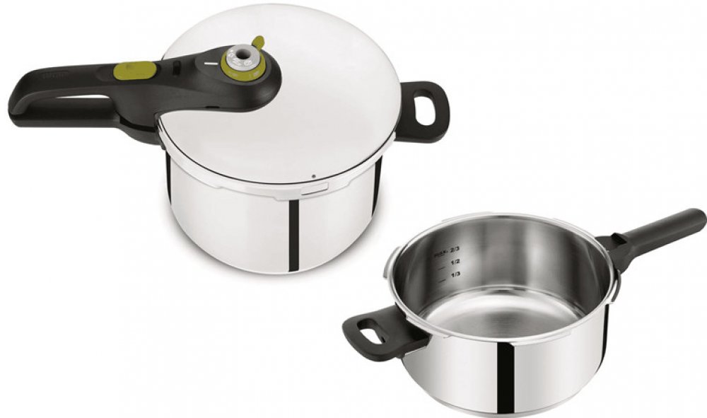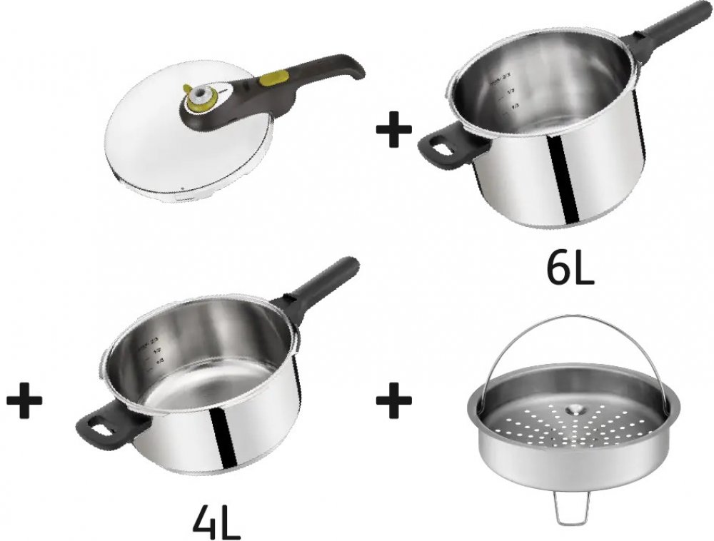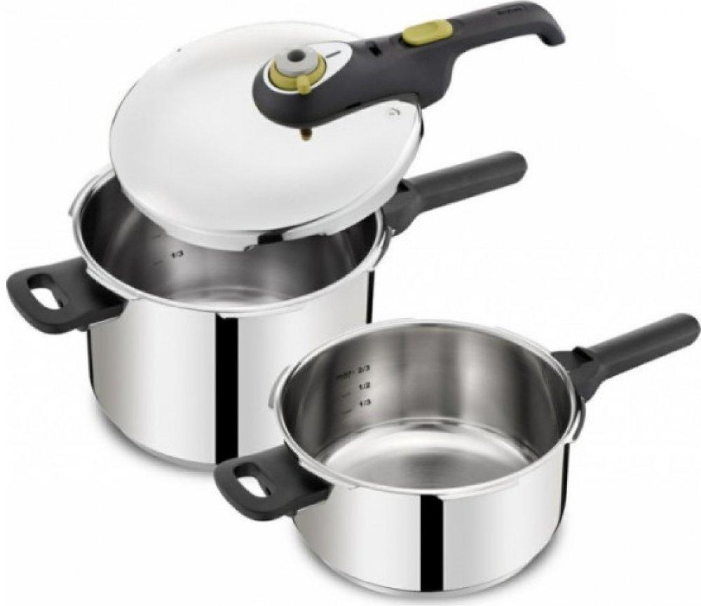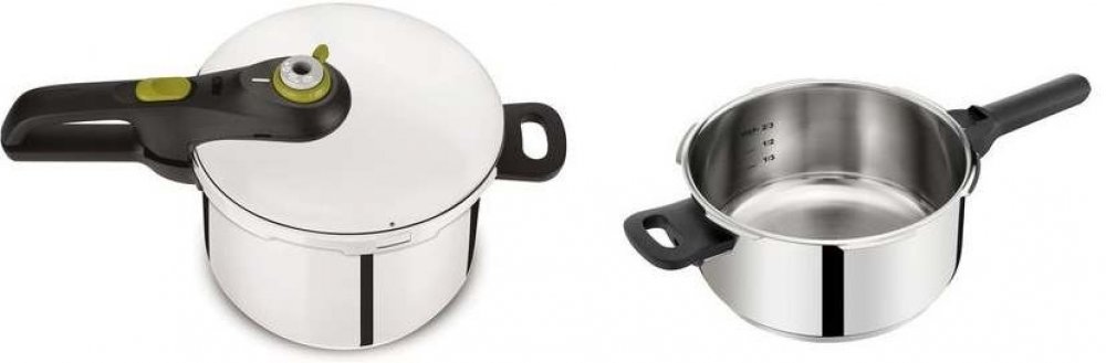Firma Tefal má dlouholetou tradici ve výrobě tlakových hrnců a je v tomto oboru jedničkou na trhu. Tlakový hrnec Tefal Secure 5 NEO má nový design rukojeti, která se nyní pohodlněji otevírá a při uzavření se sama uzamkne. Je vyrobený z kvalitní 18/10 nerezové oceli. Umožňuje vaření na nízký nebo vysoký tlak a součástí je také nerezový košík k vaření zeleniny v páře. Velkou přednostní tohoto tlakového hrnce je snadné otvírání. Páru vypustíte jednoduchým otočením kolečka a poté stačí poklici pouze posunout mírně do boku a nadzvednout. Cenově výhodná sada obsahuje tlakovou poklici a hrnce o objemech 6 l a 4 l.