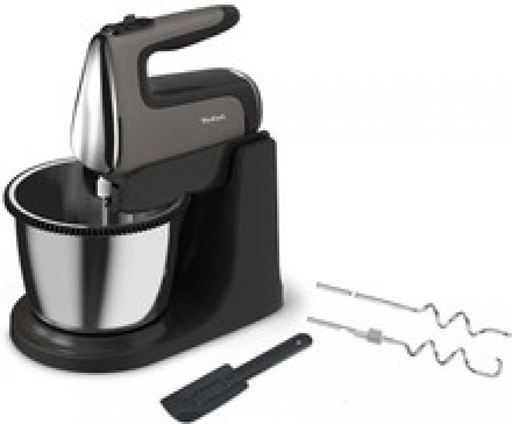 Balení mixéru Tefal HT654E38 Powermix Silence je vybaven stojanem s automaticky rotující nerezovou mísou o objemu 2,5 l a obsahuje šlehací metly, hnětací háky a praktickou stěrku.