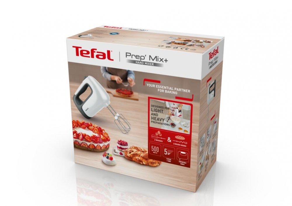 Domácímu pečení se nic nevyrovná, ať už jde o lahodné chutě nebo čiré potěšení při sledování toho, jak si vaši přátelé a rodina pochutnávají na vašich čerstvě upečených dobrotách. Značka Tefal nyní nabízí ideálního společníka pro dokonalé pečení na dosah ruky: ruční mixér Tefal Prep'Mix. Tento všestranný mixér vám dává na dosah ruky nekonečné možnosti. Je toruční mixér s vysoce výkonným motorem o příkonu 500 W. Dvě nerezové šlehací metly zajistí lehkou přípravu surovin, až už mixováním či šleháním k dokonalosti, a dva nerezové hnětací háky si poradí s hutnými těsty. Navíc je součástí vysoce výkonný nástavec pro ruční mixování s vynikající funkcí ponorného mixéru. Objevte ruční mixování, které už nemůže být jednodušší díky 5 rychlostem a nastavení Turbo. Výkon je doplněn chytrým designem s ergonomickou a strukturovanou rukojetí a stabilní odkládací polohou, která zajistí čistou kuchyňskou linku, a s odnímatelnými díly vhodnými pro mytí v myčce pro jedinečnou každodenní praktičnost.