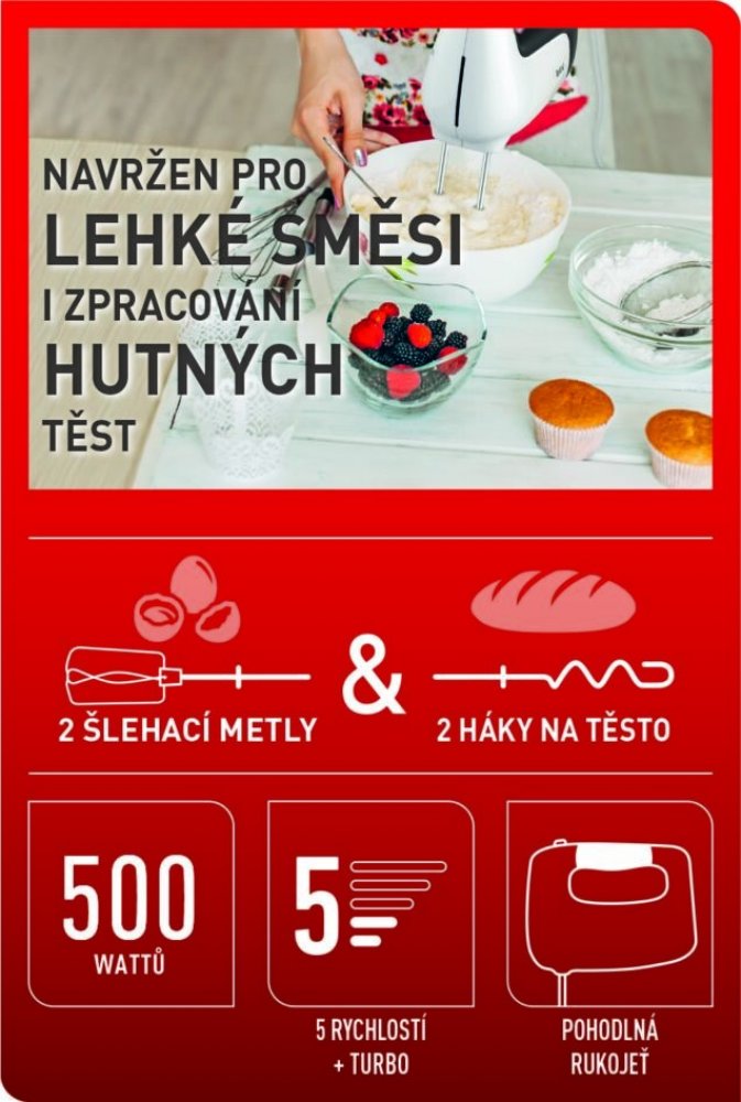 Tento produkt je navržený tak, aby splňoval všechny vaše potřeby při pečení. Má 5 rychlostí a nastavení Turbo a poradí si s širokou řadou receptů.