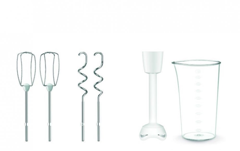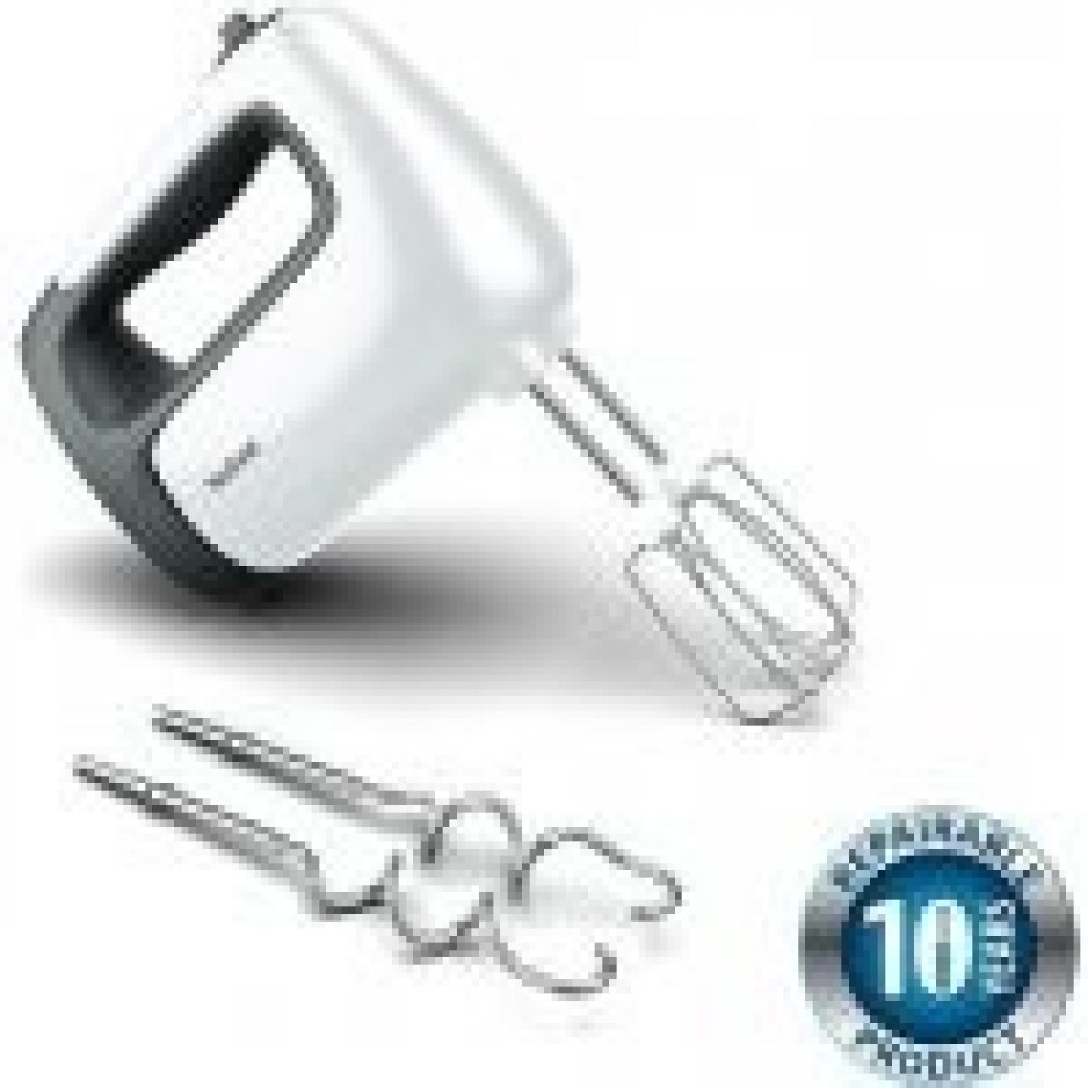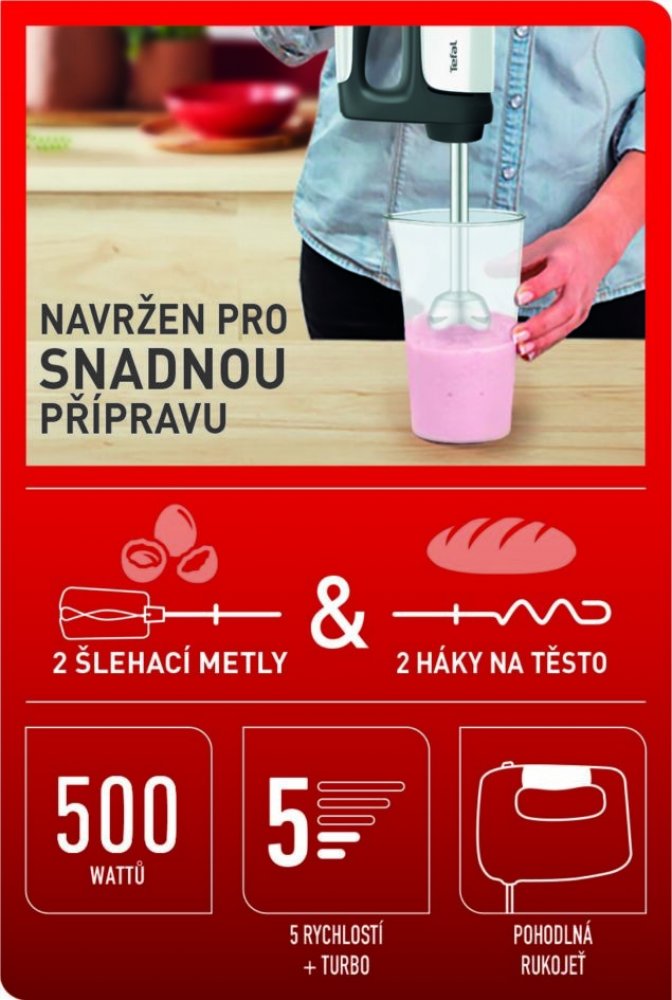 Příkon 500 W, 5 rychlostí, nastavení Turbo, 2 šlehací metly, 2 hnětací háky, nástavec pro ruční mixování.