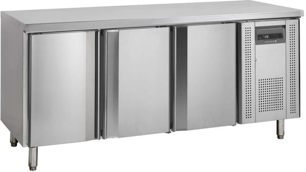 Chladicí stůl třídvéřový TEFCOLD CK 7310 SP GN1/1 bez zadního lemu do profesionálních kuchyní a gastroprovozů, s objemem 402 l, ventilovaném chlazením, se 3 křídlovými samozavírací dveřmi, 3 roštovými policemi, provotní teplotou -2 °C až +10 °C.