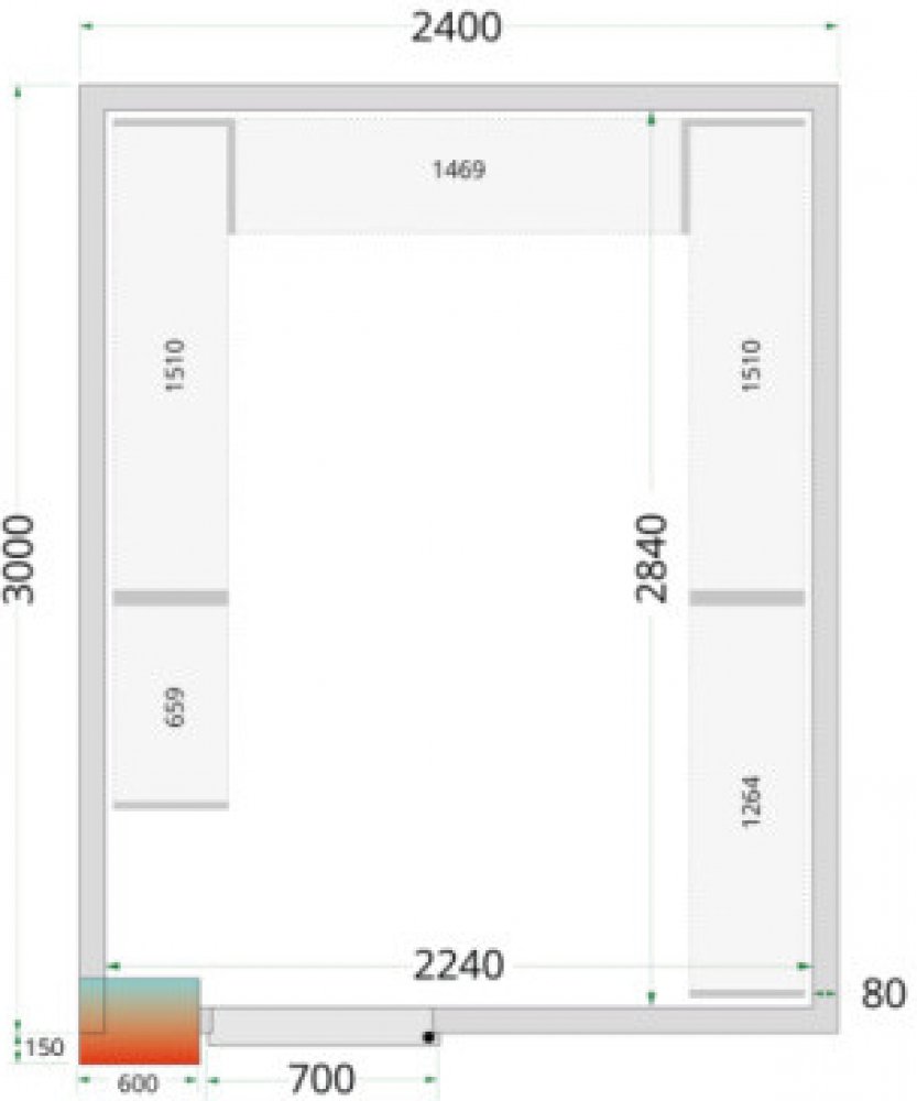 Vnější rozměry: 2400 x 3000 x 2200 mm – umožní skladování vysokých objemů potravin a materiálů.
