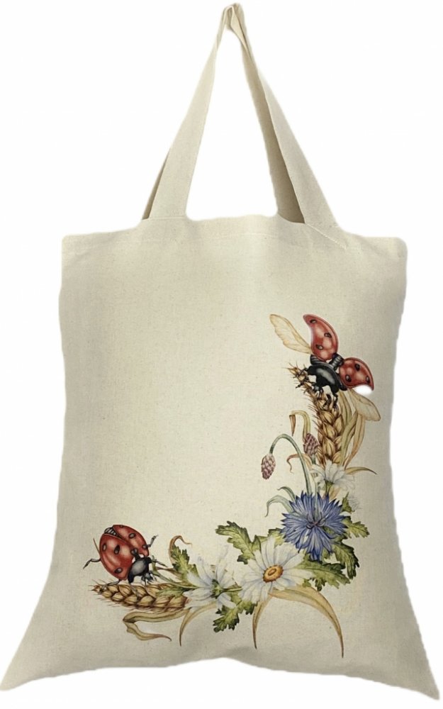 Tašku zdobí nádherný motiv lučních květin, klasů obilí a dvou berušek, které dodávají designu jemnost a přírodní kouzlo. Barevná kombinace modrých chrp, bílých kopretin a červených berušek krásně kontrastuje s neutrálním pozadím. Díky pevnému materiálu a kvalitnímu šití je odolná a vhodná pro každodenní použití, ať už na nákupy, knihy nebo jiné drobnosti.