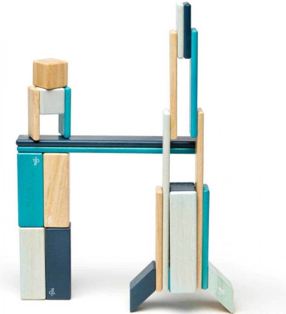 Magnetická stavebnice Tegu Blue obsahuje 24 dřevěných magnetických dílů ve šesti tvarech uložených v pěkné krabičce, na které najdete také inspiraci pro stavění.