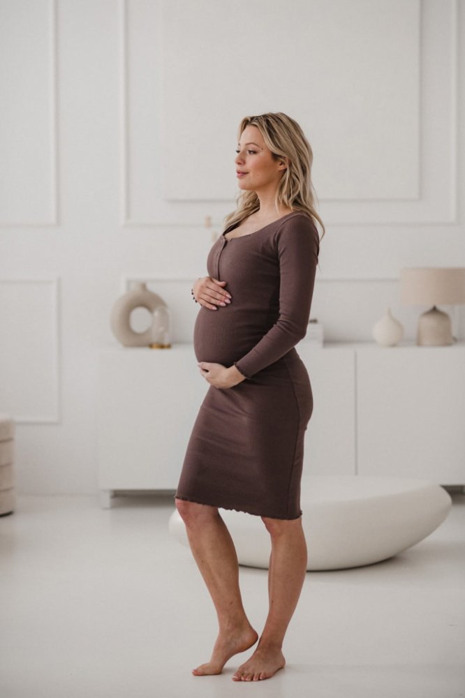 Pohodlné šaty z vroubkované bavlněné látky úzkého střihu. Díky zapínání na patentky jsou vhodné i pro období kojení.