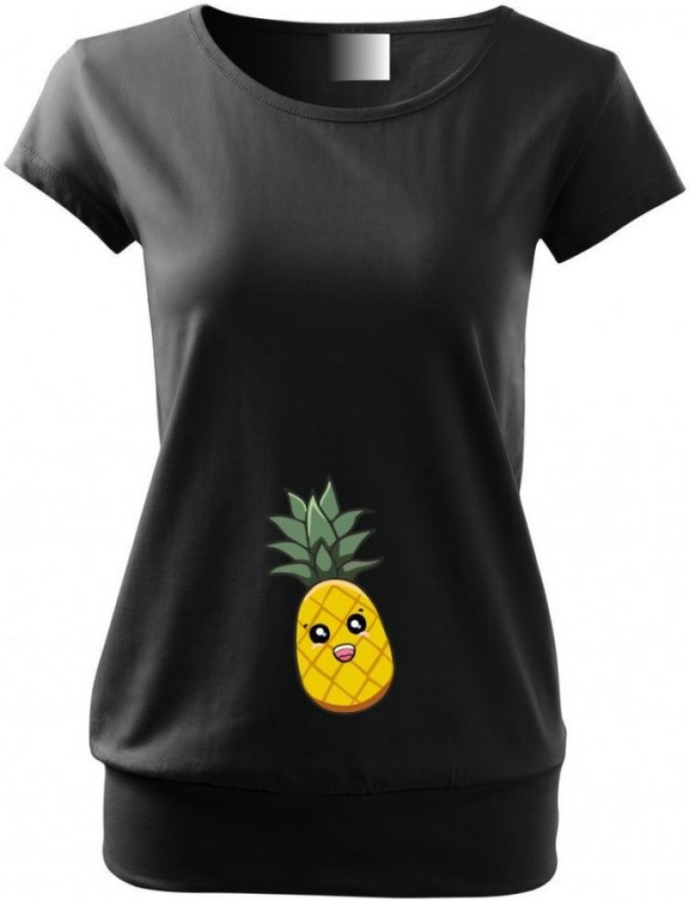 Těhotenská tričko s potiskem Ananas je ze 100% bavlny a má široký lem kolem pasu tudíž Vám z trička nepoleze bříško. Je s krátkým rukávem a ramena zpevňuje všitý proužek. Další výhodou je jeho volný střih, ve kterém se budete cítit opravdu pohodlně.