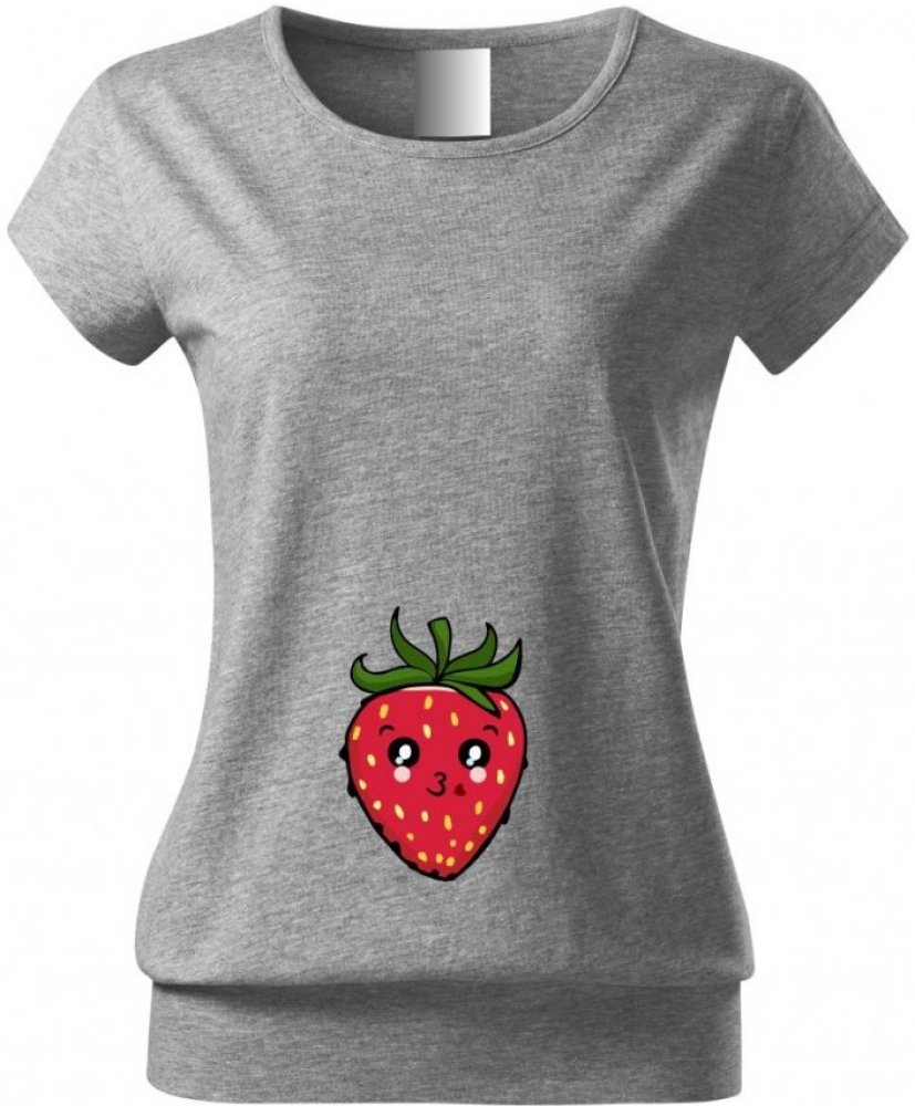 Těhotenská tričko s potiskem Jahoda je ze 100% bavlny a má široký lem kolem pasu tudíž Vám z trička nepoleze bříško. Je s krátkým rukávem a ramena zpevňuje všitý proužek. Další výhodou je jeho volný střih, ve kterém se budete cítit opravdu pohodlně.