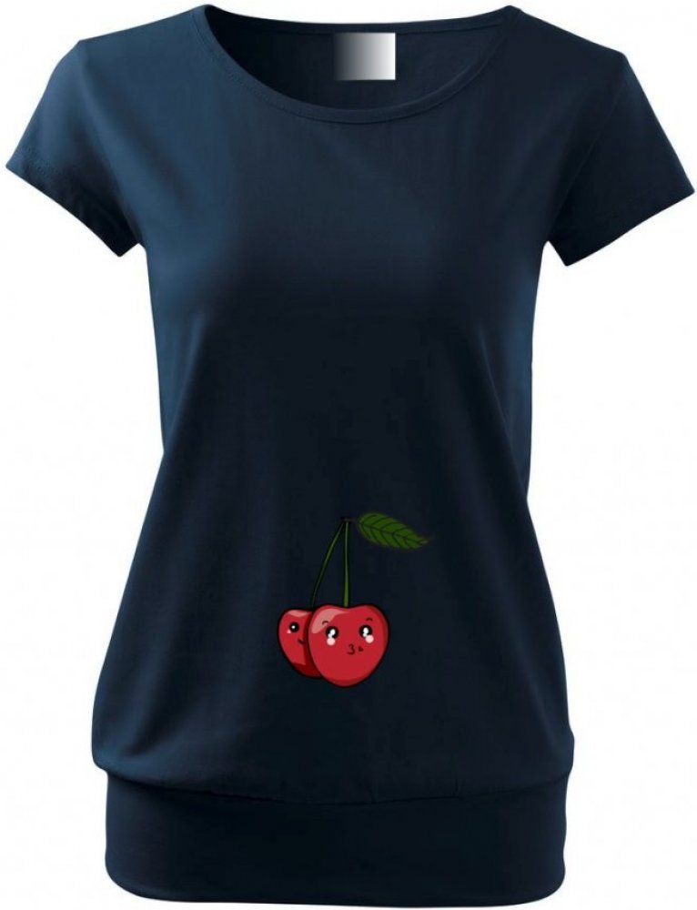 Těhotenská tričko s potiskem Třešeň je ze 100% bavlny a má široký lem kolem pasu tudíž Vám z trička nepoleze bříško. Je s krátkým rukávem a ramena zpevňuje všitý proužek. Další výhodou je jeho volný střih, ve kterém se budete cítit opravdu pohodlně.