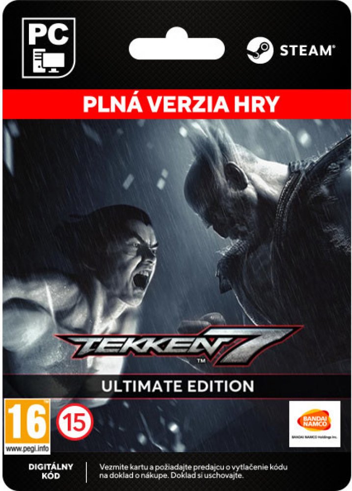 Elektronická licence určená pro platformu Steam Kupte si TEKKEN 7 - Ultimate Edition a získejte ty nejkomplexnější zážitky ze hry TEKKEN 7! Tato edice obsahuje plnou hru TEKKEN 7, veškerý doplňkový obsah ze Season Pass 1 & 2 a hratelnou postavu Eliza. Odhalte epické zakončení příběhu klanuMishima i důvody stojící za všemi krokyv jejich věčném boji. Unreal Engine 4 propůjčuje hře TEKKEN 7 sílu, která přináší strhující příběhové bitvy ve filmovémzpracování a nelítostné duely, které sidíky inovativním bojovým mechanikám vychutnají přátelé i soupeři. Láska, odplata, pýcha. Každý má důvod bojovat. Hodnotový systém z nás dělá lidi,nezávisle na našich silných i slabých stránkách. Není špatných motivací, jen cesta, kterou si vybereme. Prodlužte dobrodružnou cestu svého bojovníka a zakupte si samostatný Season PassTekken 7, s nímž získáte přístup ke strhujícímu rozšiřujícímu obsahu. Návod na aktivaci elektronického klíče pro Steam: 1. Nainstalujte si program Steam – ke stažení zde: https://store.steampowered.com/about/?l=czech a klikněte na „NAINSTALOVAT SLUŽBU STEAM“. 2. Jestliže ve službě Steam nemáte účet, klikněte po spuštění aplikace na „VYTVOŘIT NOVÝ ÚČET a pokračujte dle pokynů. 3. Následně se přihlaste se ke svému účtu ve službě Steam. 4. Na obrazovce Steamu klikněte vlevo dole na tlačítko „+ PŘIDAT HRU“ a zvolte si „AKTIVOVAT PRODUKT VE SLUŽBĚ STEAM“. 5. Postupujte podle pokynů na obrazovce a zadejte aktivační klíč a dokončete aktivaci. 6. Produkt zobrazí na levé straně obrazovky v sekci knihovna her. 7. V případě her můžete začít stahovat hru, kterou budete po stažení moci spustit. 8. V případě dobití peněženky se doplní kredit na účtu.