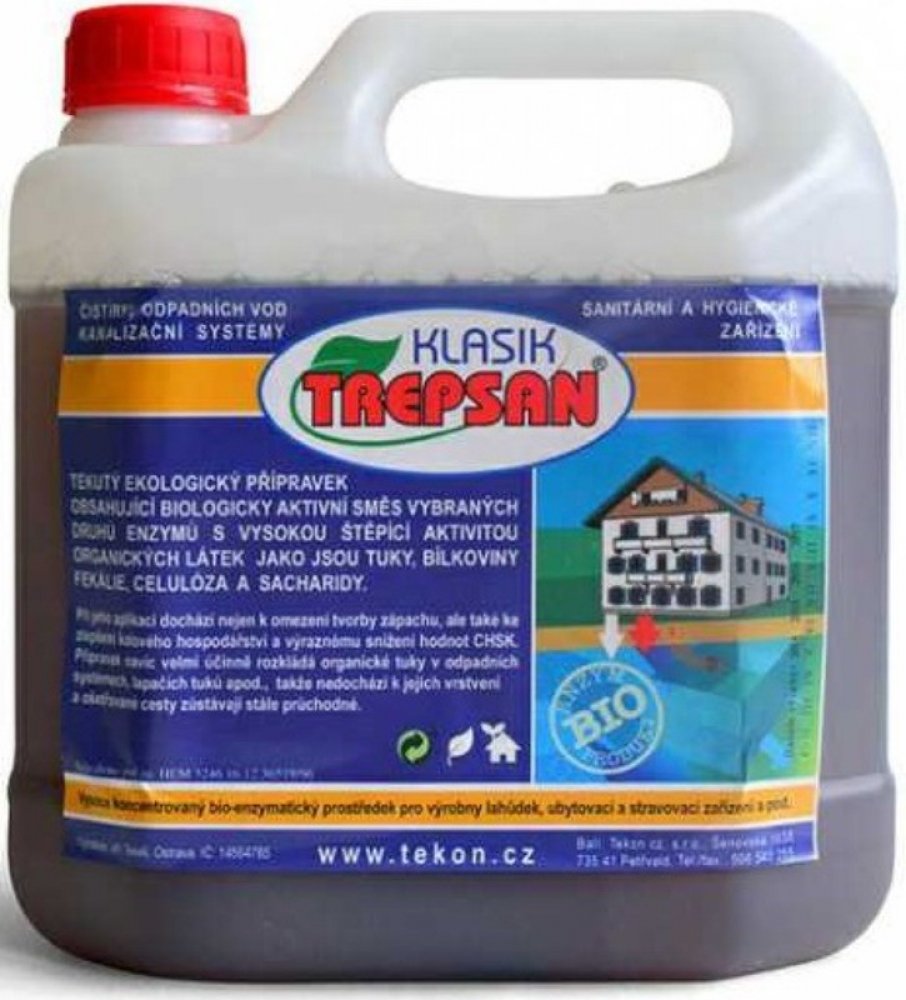 Trepsan Klasik je ideální nalít do kuchyňského nebo koupelnového odpadu, kde už v začátku rozkládá tuky a tím předchází ucpávání potrubí. Je také možné ho aplikovat přímo do vstupní části čistírny. Výrobku nevadí ani protékající voda, protože se okamžitě naváže na nečistoty i staršího data.