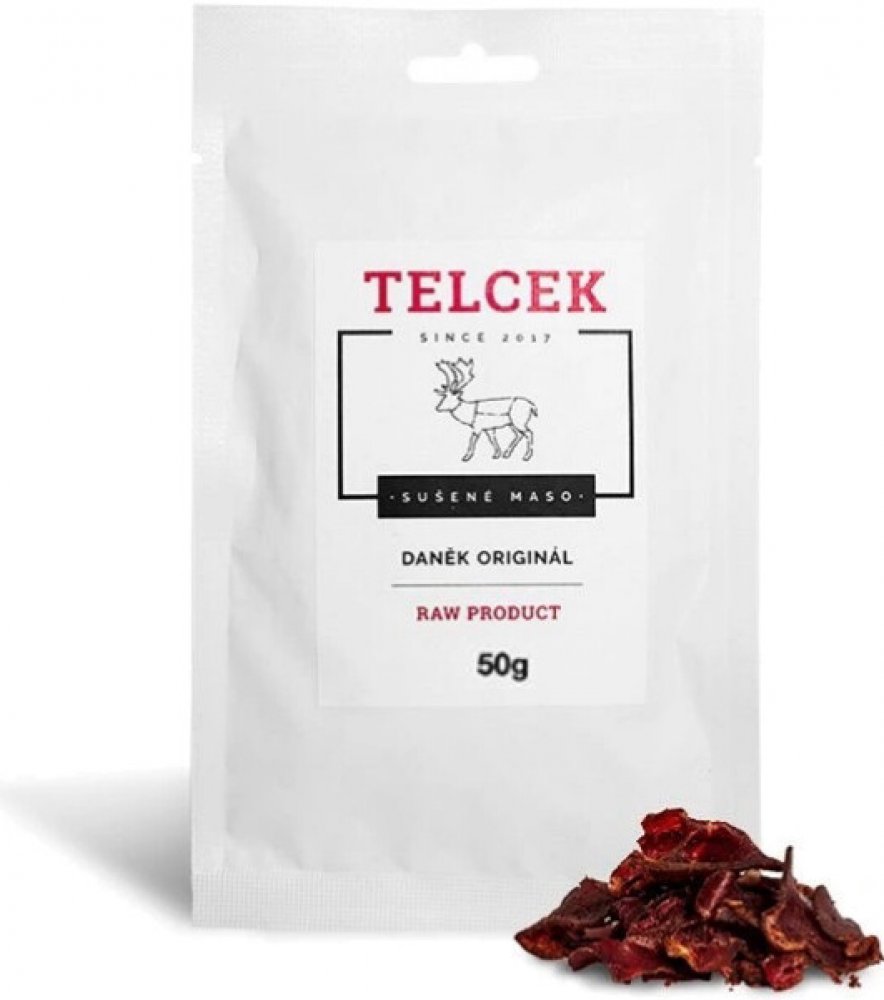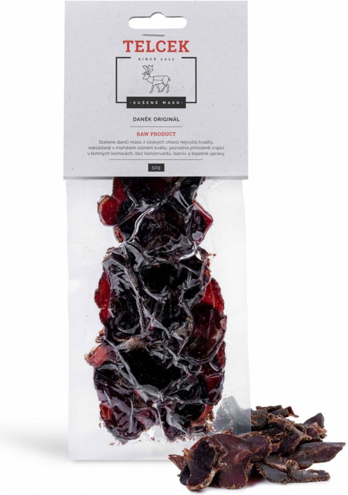 Sušené maso Telcek je výbornou variantou na mlsání. Velice chutné maso, které je sušeno pomulu a pouze vzduchem zajišťuje tu nejvyšší kvalitu. Samotné maso pochází z biochovů a pohladí vaše chuťové pohárky.