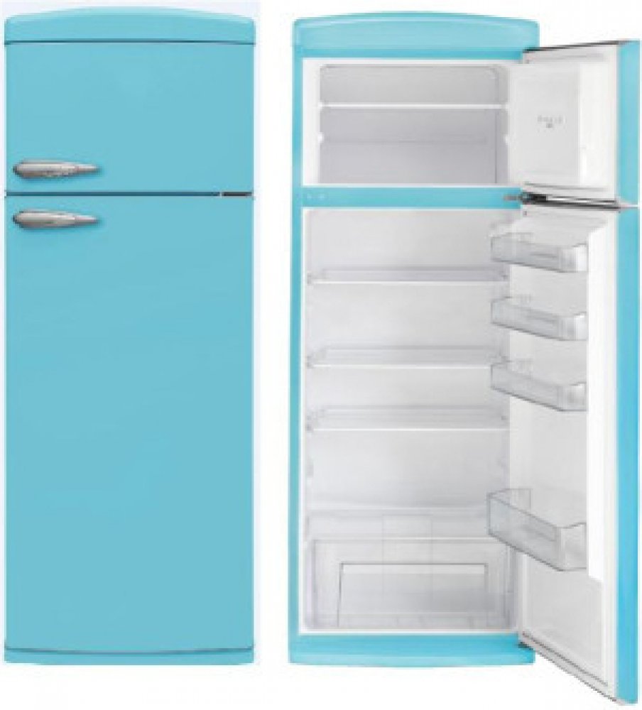 Retro chladnička s mrazákem nahoře Telefunken TFK 643 FBU 5, energetická třída E, barva modrá, objem chladničky 242 l, objem mrazáku 40 l, kompresor 1, mrazící kapacita 4,5kg/24 h, odmrazování chladničky - automatické, kategorie mrazáku 4 ****, 2 natavitelné nožičky, 2 kolečka, hlučnos...
