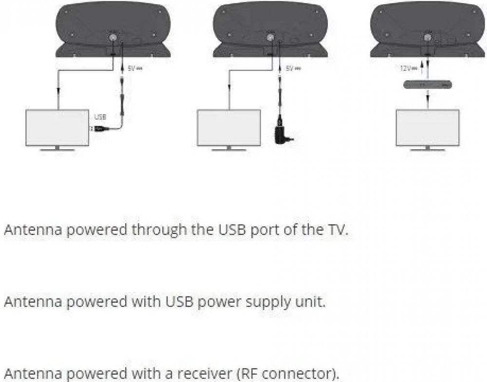 Anténu lze napájet 5V přímo z TV nebo set top boxu přes USB konektor. Stačí propojit dodávaný kabel s USB portem v TV a na druhé straně přes micro USB port s anténou.