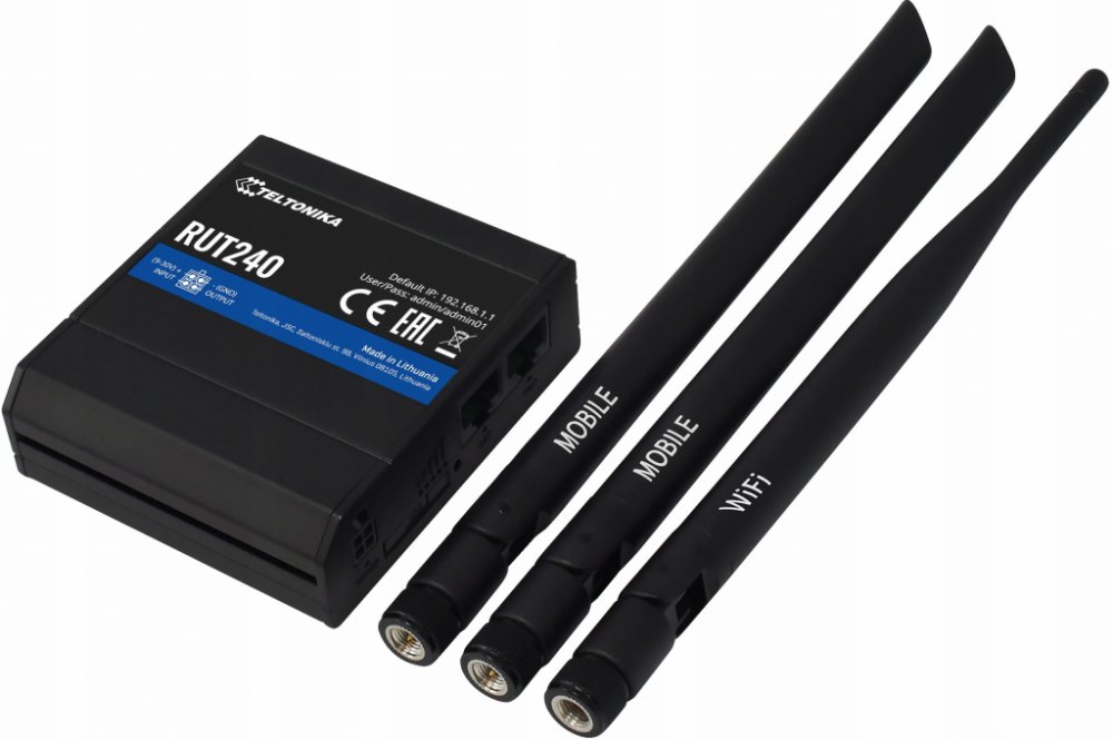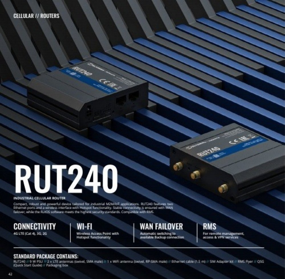 SMA konektory pro připojení externích antén dovolují anténu umístit na vhodné místo k dosažení co možná nejvyšší úrovně přijímaného signálu. RUT240 podporuje špičkové bezpečnostní funkce a je často používán jako 4G záloha. Vzdálené připojení, Out-of-Band management, pokročilé VPN funkce a podpora tunelů z něj dělá ideální zařízení pro IoT sítě.