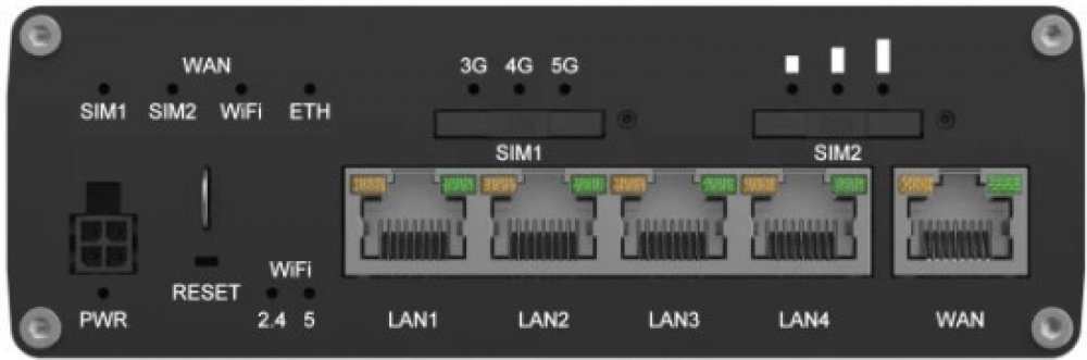 - Rozhraní:5× 10/100/1000 Mbps (1× WAN, 4× LAN), 4× SMA for 5G, 3× RP-SMA for WiFi, 1× SMA for GNSS, 1× digital in, 1× digital out, 1× USB, 2× SIM slot (Mini SIM – 2FF)