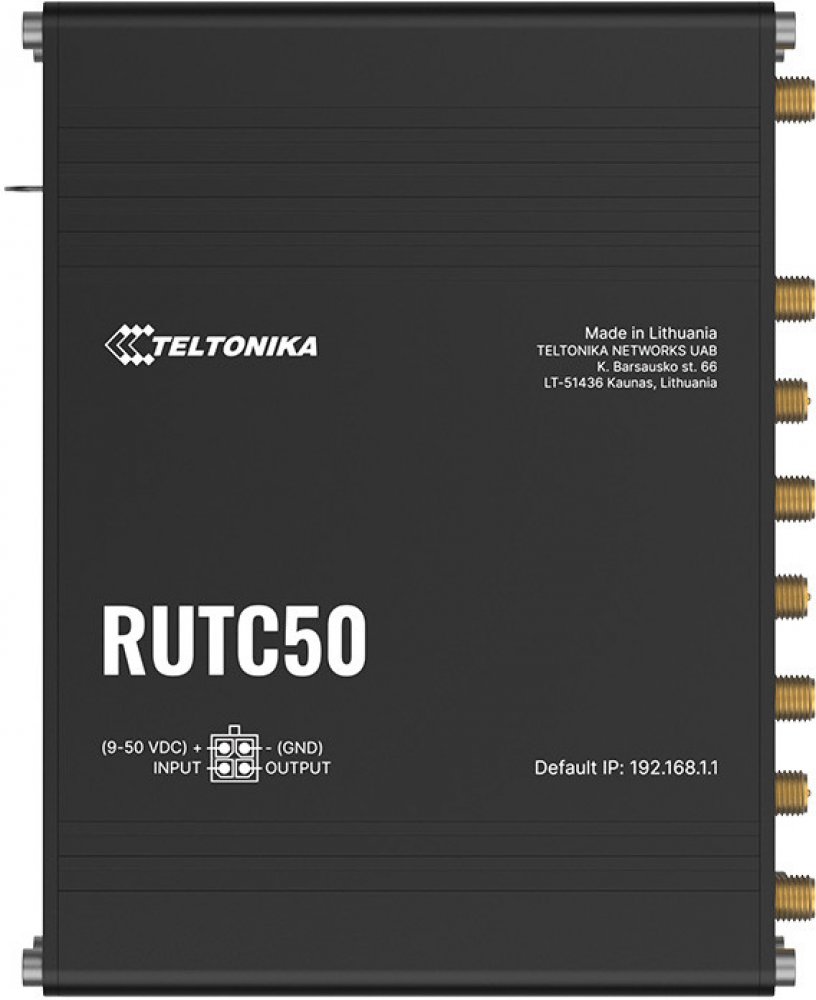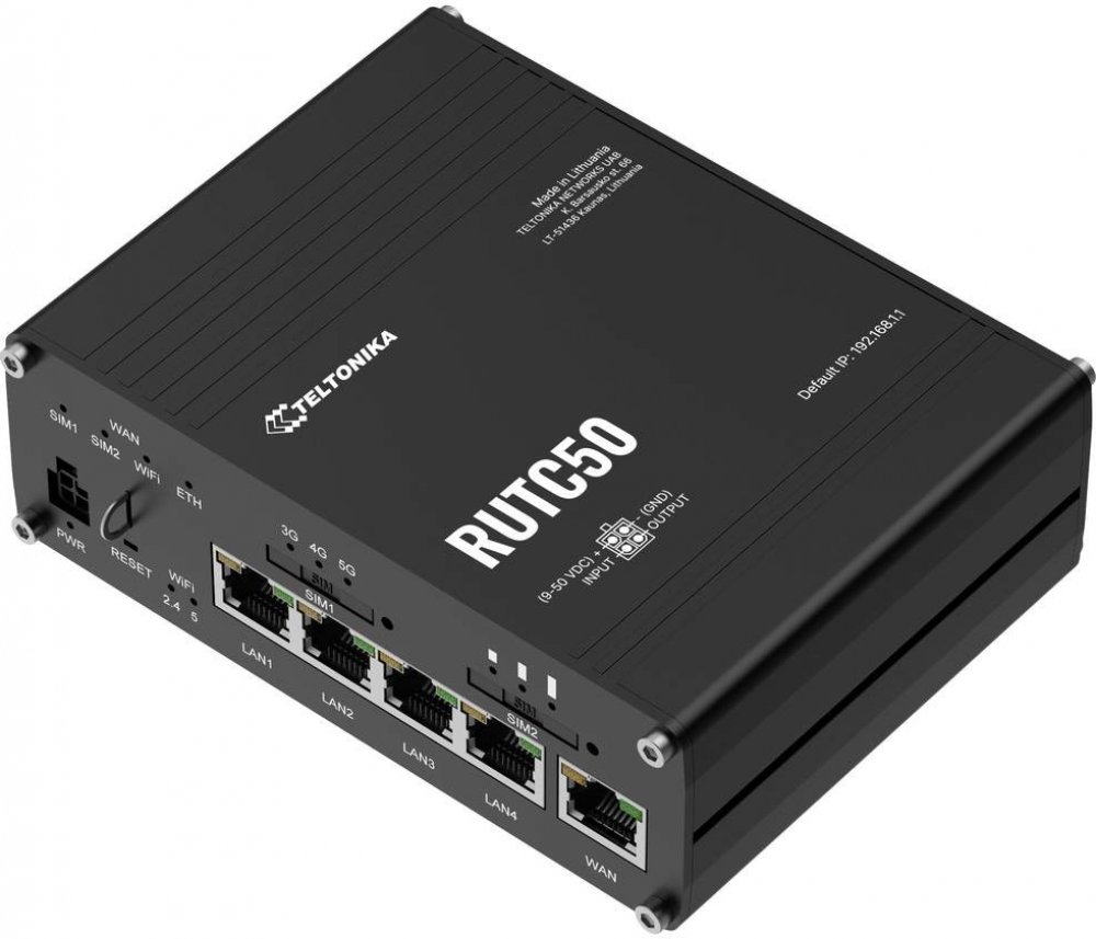 Teltonika RUTC50 je robustní průmyslový router, který nabízí 5G mobilní komunikaci pro vysokorychlostní a datově náročné aplikace. Mobilní komunikace 5G s možností dual SIM (plus eSIM - až 7 eSIM profilů) konfigurace je kombinovaná s 5 porty Gigabit Ethernet a Wi-Fi 6, umožňuje spolehlivý přenos dat s ultra nízkou latencí.
