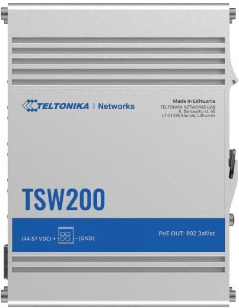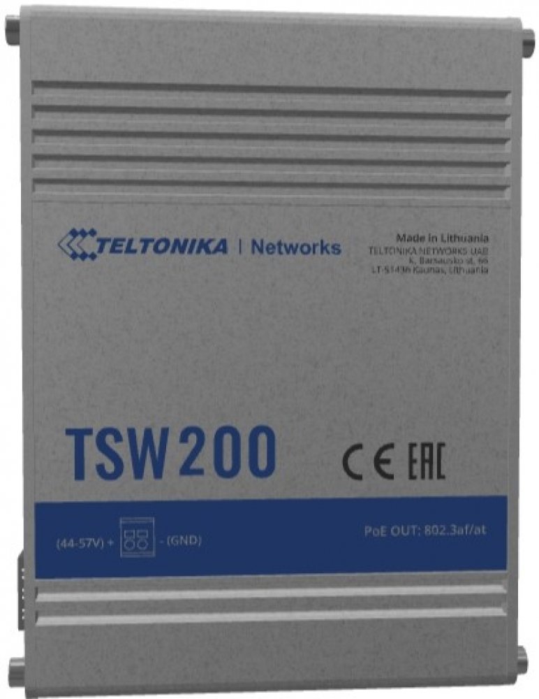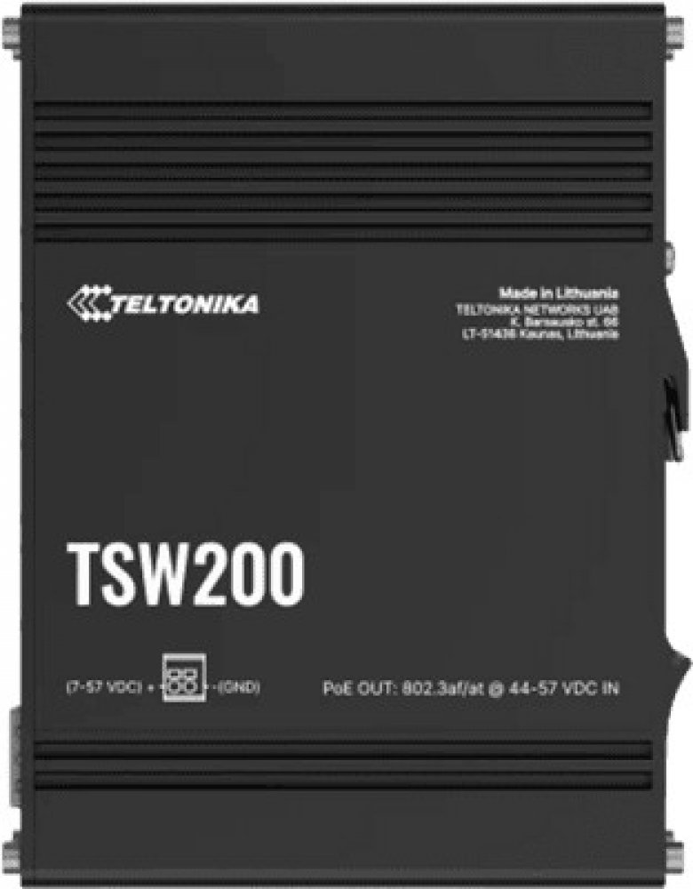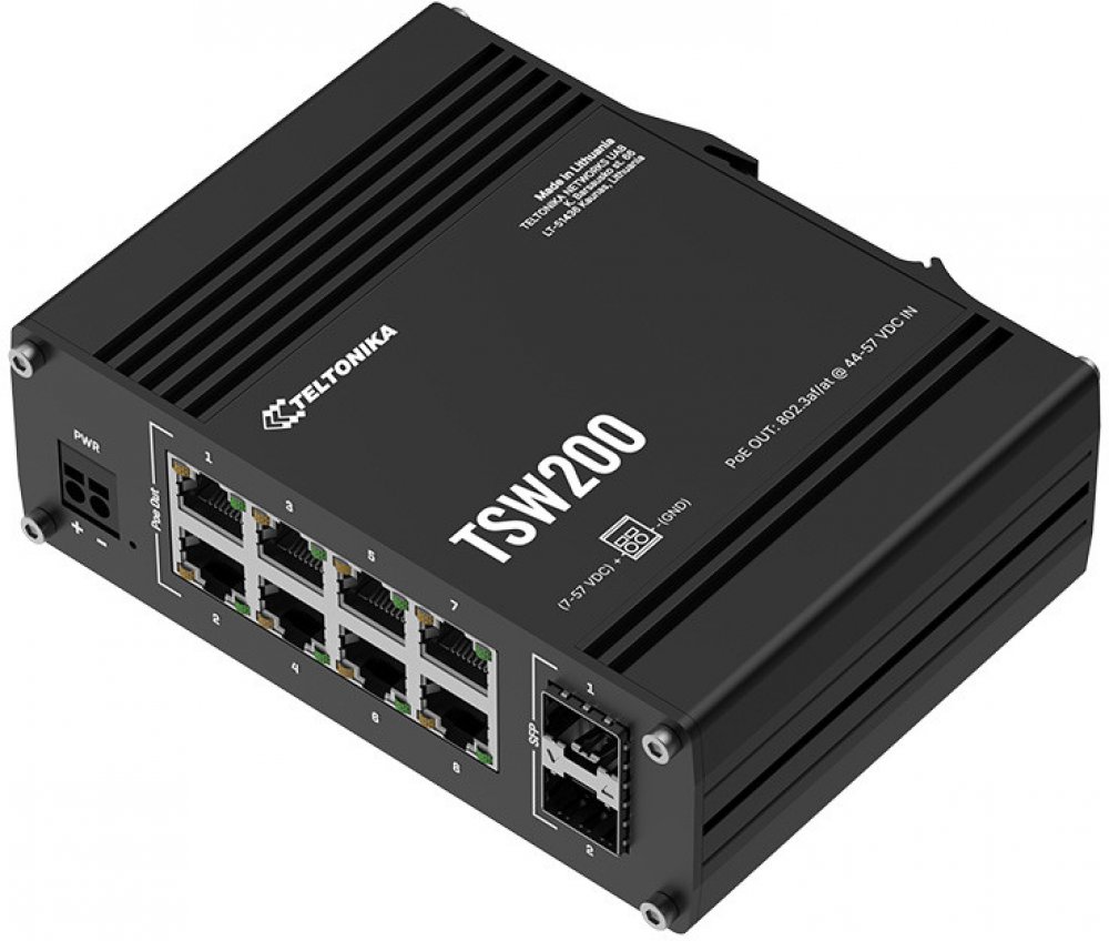 Průmyslový unmanaged switch Teltonika TSW200 od společnosti Teltonika Networks je vůbec prvním PoE+ přepínačem, který byl navržen tak, aby poskytoval svým uživatelům široké možnosti správy sítě a zároveň centralizoval distribuci napájení. Díky PoE+ je umožněna flexibilita při správě řešení a napájení, dále je vylepšená komunikace M2M s podporou široké škály průmyslových protokolů včetně EtherNet/IP, Profinet a MRP. TSW202 je vybaven 8 Gigabit Ethernet porty, z nichž každý poskytuje 30W výkonu (celkové napájení až 240W) a zároveň má 2 vysoce výkonné SFP porty pro dálkovou komunikaci pomocí optických vláken.