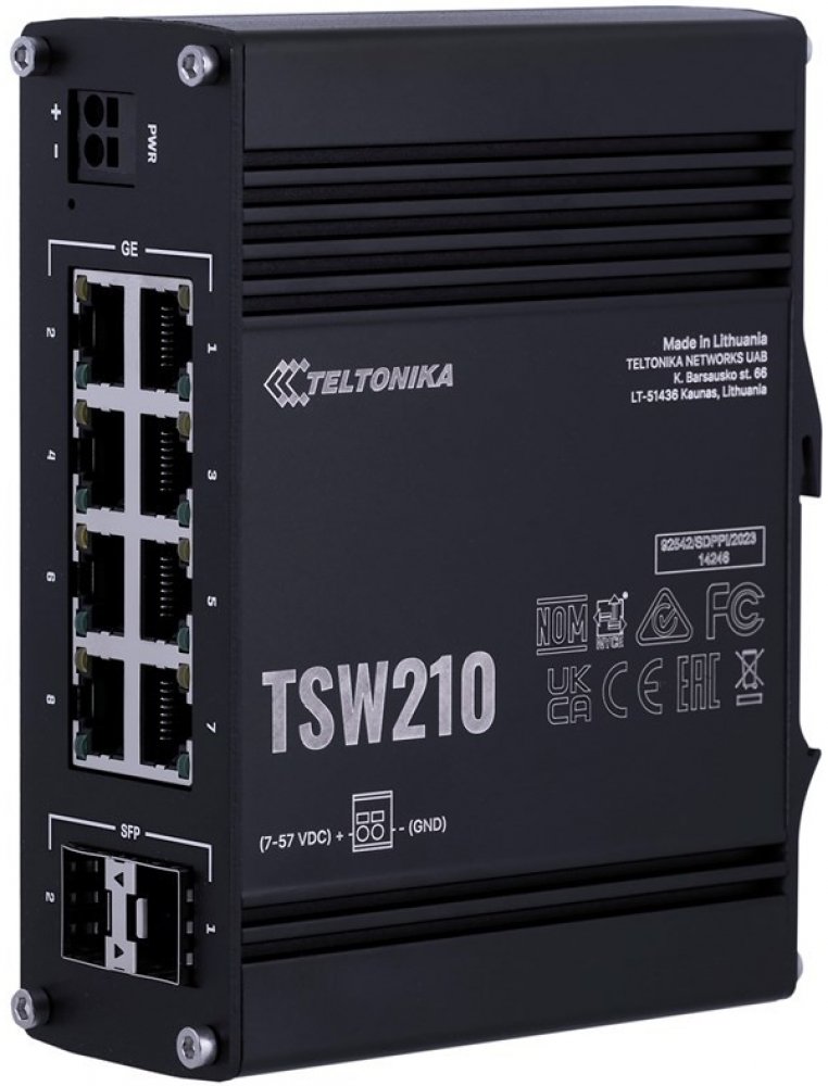 Switch Teltonika TSW210 je průmyslový neřízený přepínač pro centralizaci vašich zdrojů. Vybaven je 2 porty SFP pro komunikaci přes optická vlákna na dlouhé vzdálenosti. Jeho nedílnou součástí je také 8 portů typu Gigabit Ethernet s rychlostí stahování/odesílání až 1000 Mb/s.