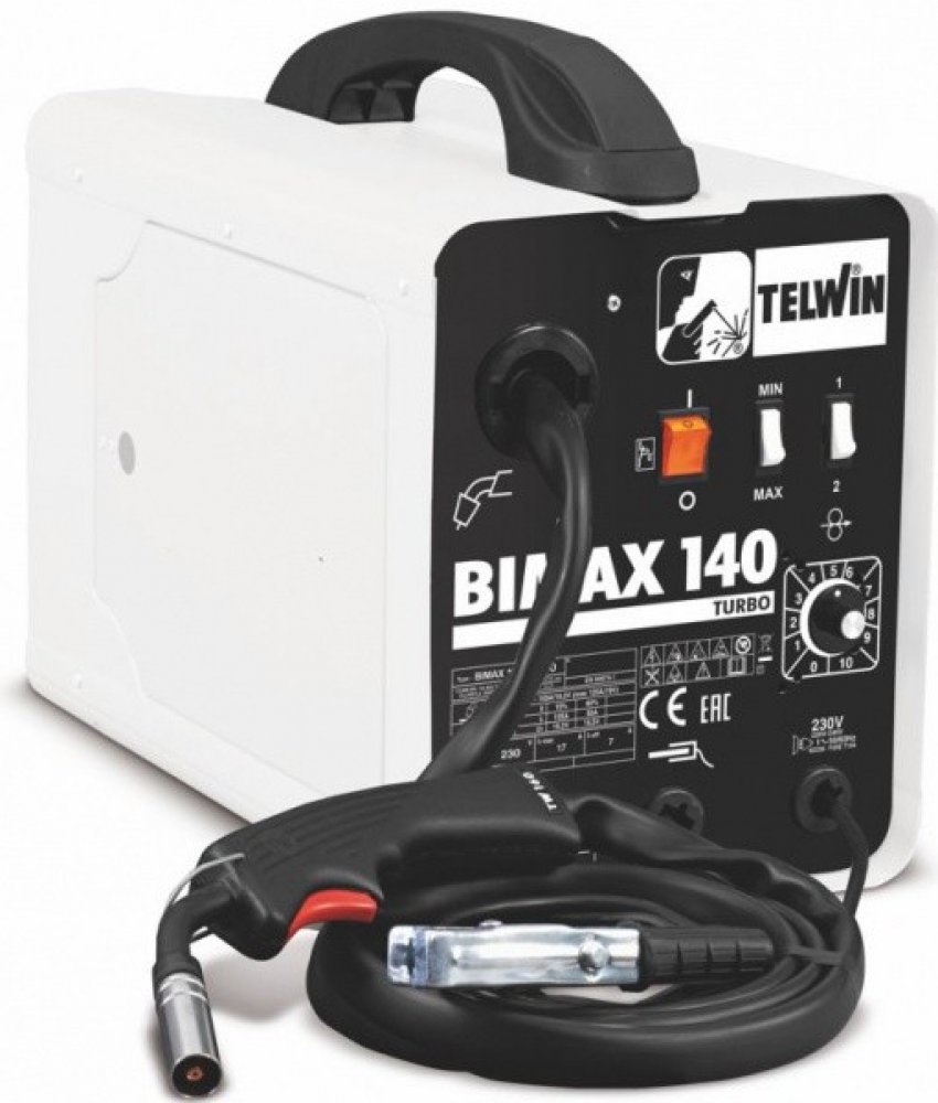 Svářečka MIG-MAG Bimax 140 Turbo Telwin Svářečka CO2 mig-mag univerzálního použití-pro sváření v ochranné atmosféře nebo bez plynu s trubičkovým svařovacím drátem, pro svařování v nepříznivých povětrnostních podmínkách. Rukojeť pro přenášení Chladící ventilátor Pro sváření bez plynu Pro sváření s ochranným plynem Tepelná pojistka Příslušenství pro svařování FLUX Svářecí drát 0,9 mm/0,2 kg FLUX pro svařování bez plynu Změna polarity pro svařování: S plynem-Bez plynu Pro cívky svařovacího drátu max. 5 kg Bez red. ventilu a plynové trysky Doporučené příslušenství na konci této stránky Včetně hořáku Technické parametry Napětí 230 V Příkon max. 3,6 kW Příkon 60% 1,5 kW Jištění 10 A Cos φ 0,9 Max.výstupní napětí 30 V= Svářecí proud 50-120 A Výkonová využitelnost - zatěžovatel při teplotě okolí 40°C ! 105 A při 15%, 50 A při 60% Počet regulačních stupňů proudu 4 Průměr plněného svařovacího drátu - sváření bez plynu 0,8-0,9 mm Průměr svařovacího drátu - hliník 0,8 mm Průměr svařovacího drátu - sváření s plynem 0,6-0,8 mm Váha 17,3 kg Třída izolace H Krytí IP 21