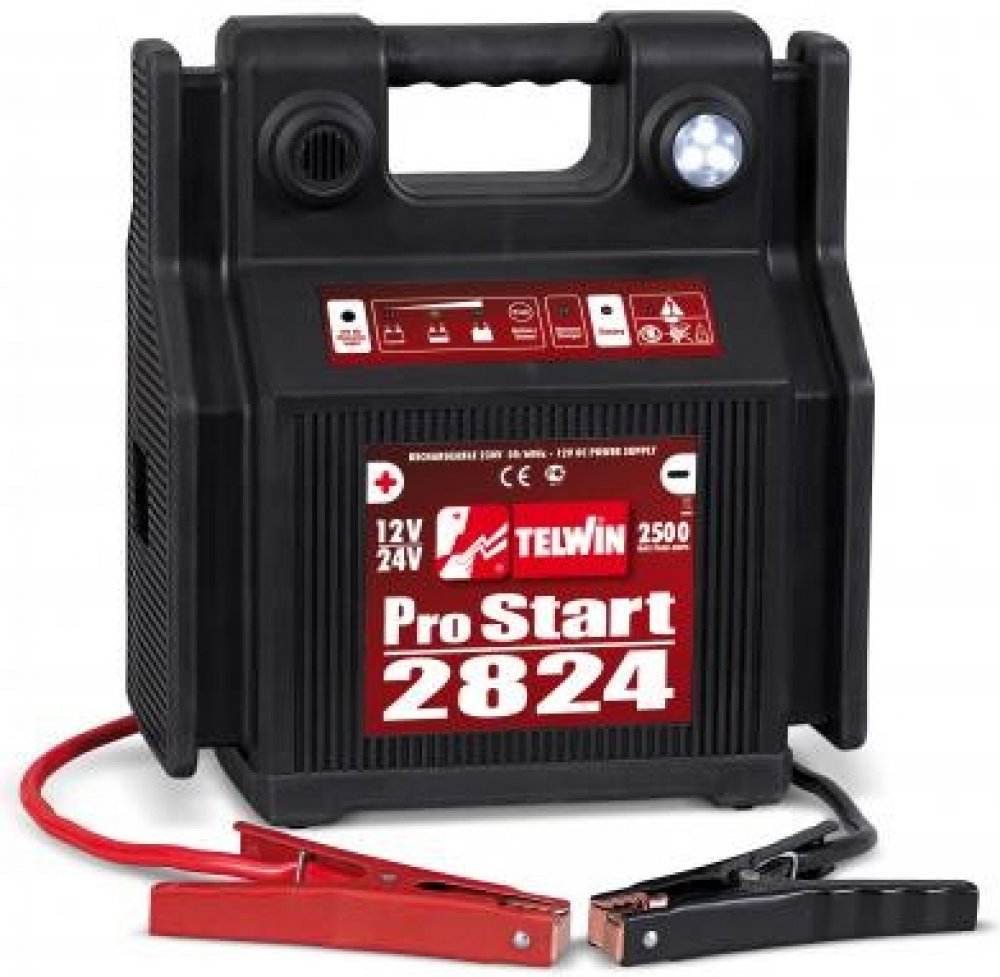 TELWIN - Pro Start 2824 - Startovací zdroj z kategorie Auto-moto | Autodoplňky | Startovací kabely od výrobce TELWIN Tyto startovací zdroje na 12 V nebo 12/24 V slouží jako nabíječka pro udržování v pohotovostním stavu baterie a pro nouzové nastartování v místech bez síťového napájení. Mají vnitřní akumulátor 22 -44 Ah. Obsahují integrovanou přenosnou svítilnu. Zásuvku 12 V pro napájení spotřebičů 12 V. Dále obsahují indikaci stavu baterie. Navíc 2 integrované výstražné blikající svítilny, USB výstup 5V pro nabíjení mobilních telefonů, GPS apod. S výstupem 12V/24V Automobil Člun Zemědělských stroj Nákladních automobil Je vybavena přípojkou na zdířku zapalovače Umožňuje ponechat obvody vozidla pod napětím v případě výměny baterie