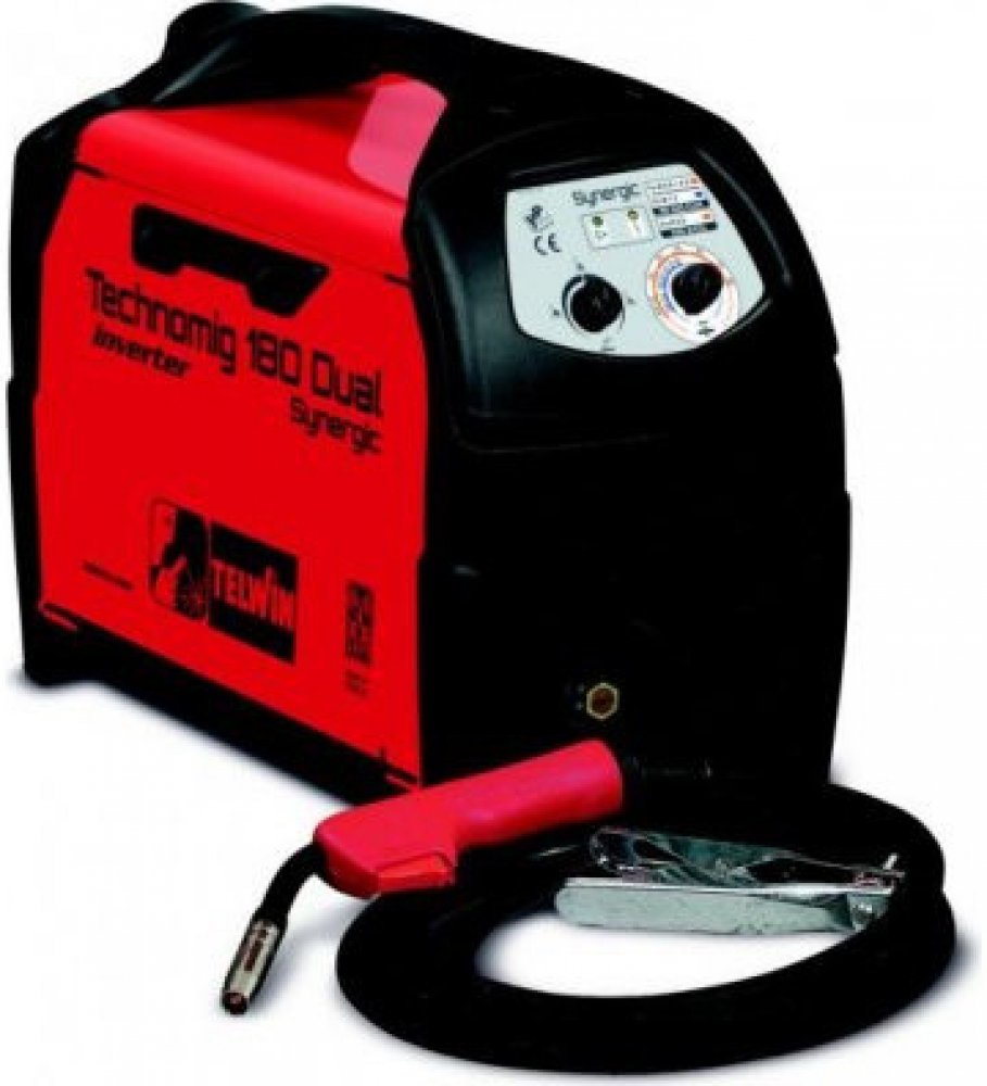 Microprocesorem řízený svářecí invertor CO2 MIG-MAG, Technomig 180 Dual Synergic Telwin, pro sváření bez plynu i s plynem, středně profesionální stroj pro autoopravárenství a malé zámečnické provozy. Hořák 2,5 m s Euro koncovkou. Naprosto jednoduché ovládání díky synergickému nastavení svářečky. (Nastavením tloušťky svařovaného materiálu se automaticky nastaví další parametry svařovacího procesu). Nastavení je možné ručně korigovat dle specifických podmínek. Tovární konfigurace nastavena pro sváření bez plynu s trubičkovým drátem FLUX. Po jednoduché změně polarity je svářečka nachystaná pro sváření s plynem MIG-MAG. Pro cívky drátu max. 5 kg. Díky plynule nastavitelnému svářecímu proudu od 20 A lze provádět tvrdé pájení bez poškození pozinkovaného materiálu za použití pájecího drátu. Dále je možné svařovat: ocel, nerez, hliník, pozinkV balení je svářečka + hořák