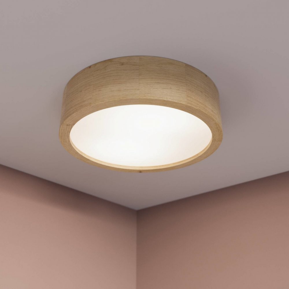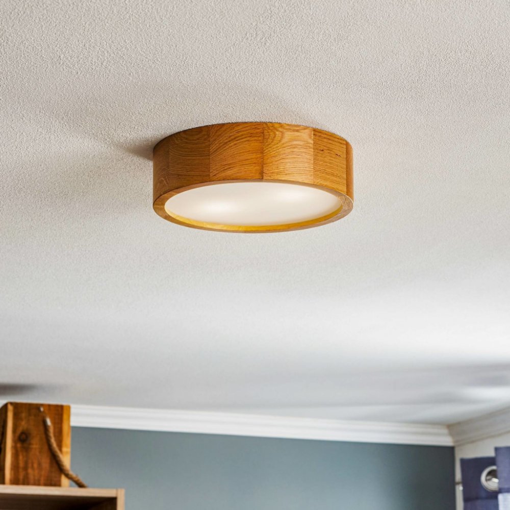 Kulaté stropní svítidlo Cleo LED s rámem z dubového dřeva obohatí mnoho moderních obytných stylů o přírodní nádech. Bílý difuzor zajišťuje velkoplošné a neoslňující rozložení světla.