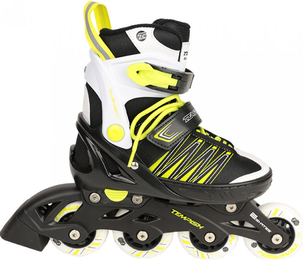 Brusle porostou s vaším potomkemDěti rostou jako z vody. Kdo si však může v dnešní době dovolit kupovat každý rok nové brusle?Stiskem jediného tlačítka na straně podvozku můžete změnit velikost bruslí až o 4 čísla!Vnější část brusle tvoří tvrdý TPU plast, který odolá i sebevětším nárazům. Samotný skelet boty se skládá z pouhých 3 dílů.Maximální ohled na pohodlí mladé nožky:<ul class="bullets"> Přes několik otvorů zakrytých jemnou síťovanou nylonovou látkou je do brusle neustále přiváděn čerstvý vzduch. Hedvábná vložka dokonale izoluje a udružuje nohu v teple. Přiměs PVC napomáhá rychlému odvodu potu a vysychání.Součástí balení jsou dva druhy podvozku: Kvalitní držák nožů se speciální povrchovou úpravou proti korozi. Podvozek pro uchycení 4 koleček o tvrdosti 82 A. Kolečka se otáčejí na odolných ložiskách řady ABEC 5. Pro velikost XS/S jsou určena kolečka o průměru 64 mm, pro velikost M pak 72 mm.Barva pro chlapcePraktická černá se zelenými nápisy se bude líbit každému. Pro holky máme <a href="https://www.sportobchod.cz/brusle-tempish-element-lady-duo.htm">Element Duo v bílé barvě.