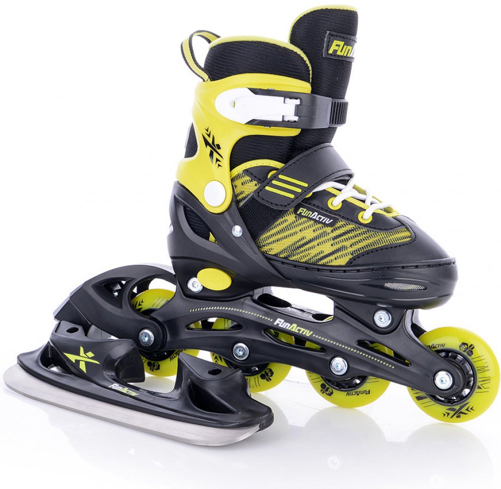 Dětské brusle 2V1 Tempish FunActive Orin boy duo - chlapecké dětské brusle s nastavitelnou velikostí boty a výměnitelným podvozkem in-line/led. Dětské brusle 2V1 Tempish FunActive Orin boy duo - chlapecké dětské brusle s nastavitelnou velikostí boty a výměnitelným podvozkem in-line/led. Tyto brusle mají speciální duální konstrukci pro jednoduchou výměnu podvozků in-line/led a jsou vhodné pro celoroční rekreační bruslení. Konstrukční systém umožňuje záměnu zimních bruslí za podvozek s kolečky. Konstrukční systém umožňuje záměnu zimních bruslí za podvozek s kolečky - tzn. umožňuje jednoduchou přestavbu na in-line brusle. Měkká rychleschnoucí výstelka zajišťuje pohodlnost dětské nohy. Samozřejmostí je možnost nastavení velikosti, kdy každá brusle má na výběr ze 4 rozměrů. Pomocí stisknutím tlačítka v boční části skeletu lze snadno a rychle nastavit velikost boty na noze uživatele. Možnost nastavení velikosti bruslí zaručuje, že Vašim dětem budou kolečkové brusle sloužit dlouho a bez starostí a může je použít i více uživatelů s různou velikostí nohy. S tímto setem 2v1 in-line/led ušetříte peníze za další pár bruslí. Za jednu cenu máte v podstatě dvoje brusle. Stačí jen lehce vyměnit podvozek lední za in-line nebo naopak. Velikost koleček: 64mm (26-29, 30-33) 70mm (34-37, 38-41) Velikost: 26-29, 30-33, 34-37, 38-41 Délka vnitřní vložky: vel.: 26-29 17,5-20,0 cm vel.: 30-33 19,0-22,0 cm vel.: 34-37 22,5-24,5 cm vel.: 38-41 25,0-28,0 cm