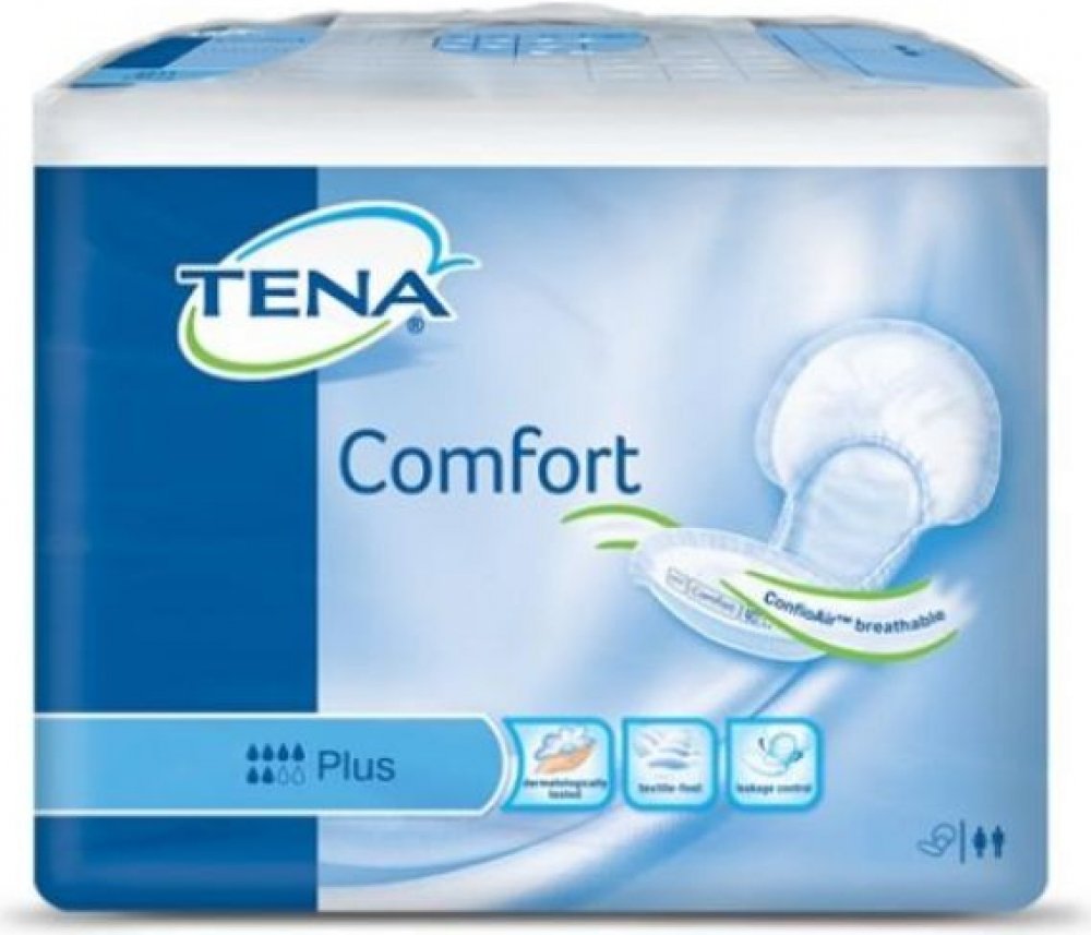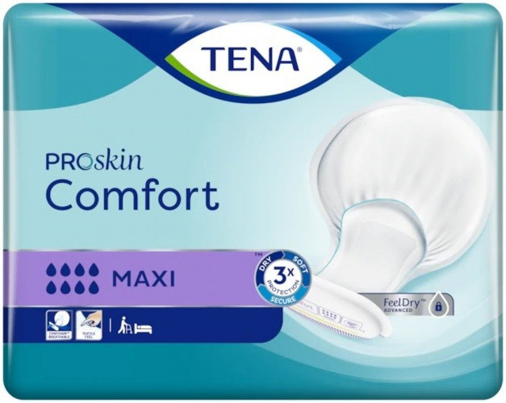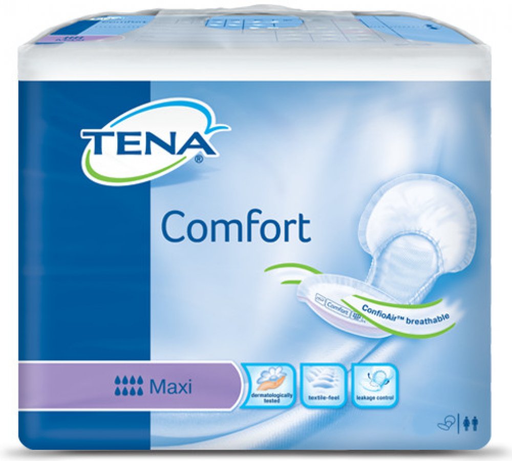 Vložné pleny TENA Comfort Maxi pro střední až těžkou inkontinenci. Doporučujeme používat s elastickými spodními kalhotkami TENA Fix.